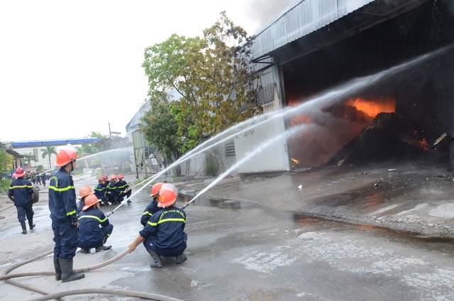 Lực lượng chức năng dập tắt đám cháy xảy ra vào ngày 13/6/2018 tại Công ty TNHH Thương binh An Hòa, xã An Hồng, huyện An Dương.