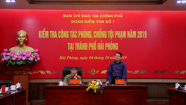 Sáng 4/10, tại Trung tâm Hội nghị thành phố, Ban Chỉ đạo 138 Chính phủ kiểm tra công tác phòng, chống tội phạm năm 2019 tại thành phố Hải Phòng. Đồng chí Lê Khắc Nam, Phó Chủ tịch UBND thành phố, Trưởng ban Chỉ đạo 799 và đồng chí Thiếu tướng Hoàng Anh Tuyên, Phó Chánh Văn phòng Bộ Công an, Ủy viên Thư ký Ban Chỉ đạo 138 Chính phủ đồng chủ trì cuộc họp. Tham dự có các thành viên Ban Chỉ đạo 138 Chính phủ; thành viên Ban Chỉ đạo 799 thành phố Hải Phòng.