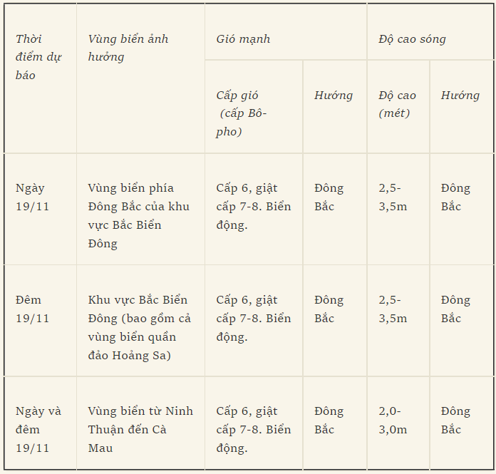 Theo tin từ Trung tâm Dự báo Khí tượng thủy văn Quốc gia, ngày và đêm 19/11 Vùng biển phía Đông Bắc của khu vực Bắc Biển Đông, vùng biển từ Ninh Thuận đến Cà Mau có gió mạnh cấp 6, giật cấp 7-8, sóng biển cao từ 2-3,50m, biển động.