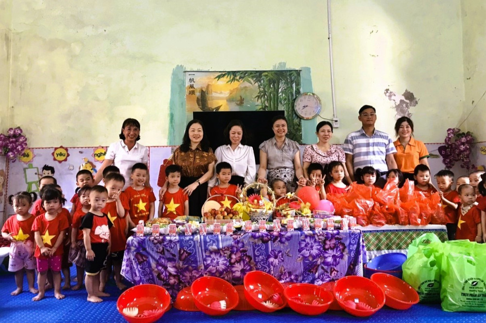 Đoàn công tác tặng quà đến thăm và tặng quà cho 108 cháu thiếu nhi là con nữ công nhân lao động có hoàn cảnh khó khăn đang học tập tại Trường Mầm non Sơn Lâm thuộc xã An Tiến, huyện An Lão; Nhóm trẻ gia đình tại thôn Khôi Vĩ Hạ, xã Quang Phục, huyện Tiên Lãng; Trường Mầm non Tuổi thơ tại xã Cao Minh, huyện Vĩnh Bảo; Trường Mầm non Ban Mai tại thôn 2, xã Tam Cường, huyện Vĩnh Bảo. Đây là các đơn vị được thụ hưởng Đề án “Hỗ trợ phát triển các nhóm trẻ độc lập tư thục tại khu vực khu công nghiệp, khu chế xuất sau năm 2020” và Đề án “Phát triển giáo dục mầm non” do Hội Liên hiệp Phụ nữ là cơ quan thường trực thực hiện.
