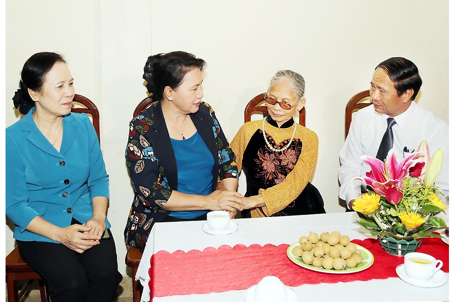 Đồng chí Nguyễn Thị Kim Ngân, Chủ tịch Quốc hội cùng các đồng chí lãnh đạo thành phố thăm và tặng quà bà Phạm Thị Luống, mẹ liệt sĩ ở Phố Mới, xã Thủy Sơn, huyện Thủy Nguyên.