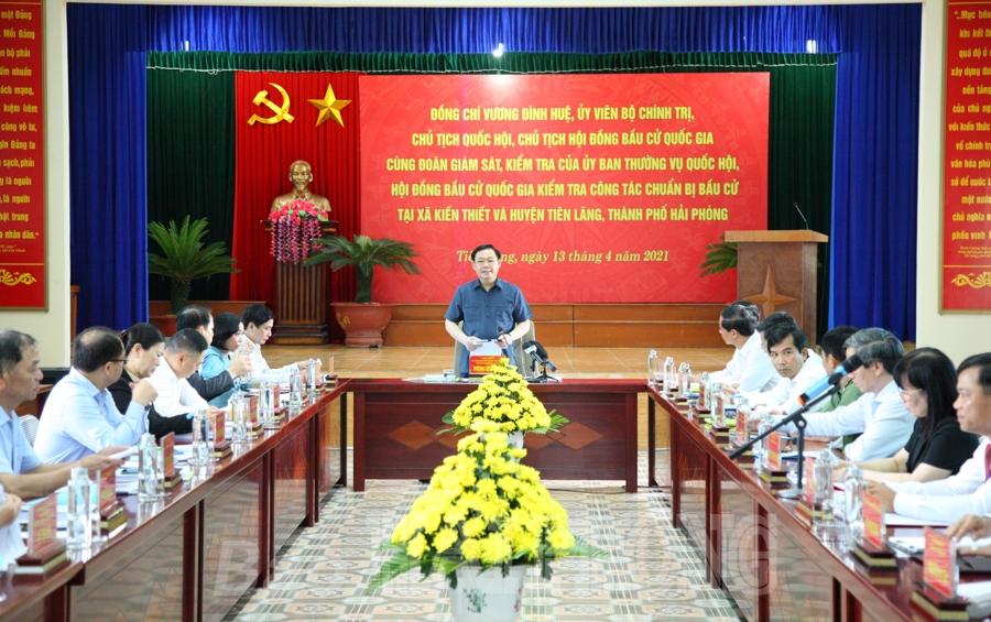 Qua kiểm tra và ý kiến của các thành viên Đoàn công tác của Ủy ban Thường vụ Quốc hội, Hội đồng Bầu cử quốc gia, đồng chí Vương Đình Huệ đánh giá cao Ủy ban Bầu cử huyện Tiên Lãng và các xã, thị trấn tập trung lãnh đạo, chỉ đạo, chuẩn bị chu đáo công tác bầu cử, bám sát kế hoạch, tiến trình theo quy định. Trong đó, việc tổ chức hội nghị lấy ý kiến cử tri nơi cư trú nhận xét về người ứng cử vừa hoàn thành, bảo đảm dân chủ, đạt kết quả, đồng thuận cao trong nhân dân. Các địa phương lập, niêm yết danh sách cử tri theo quy định. Chủ tịch Quốc hội Vương Đình Huệ chia sẻ, bản thân cảm nhận rất rõ không khí bầu cử đang thực sự lan tỏa ở địa phương. Bộ mặt nông thôn huyện Tiên Lãng và tại xã Kiến Thiết – xã thí điểm xây dựng nông thôn mới kiểu mẫu nhiều đổi thay, trang trí cổ động rực rỡ. Người dân hồ hởi, phấn khởi trước sự đổi thay của thành phố, huyện và mong chờ ngày hội bầu cử.