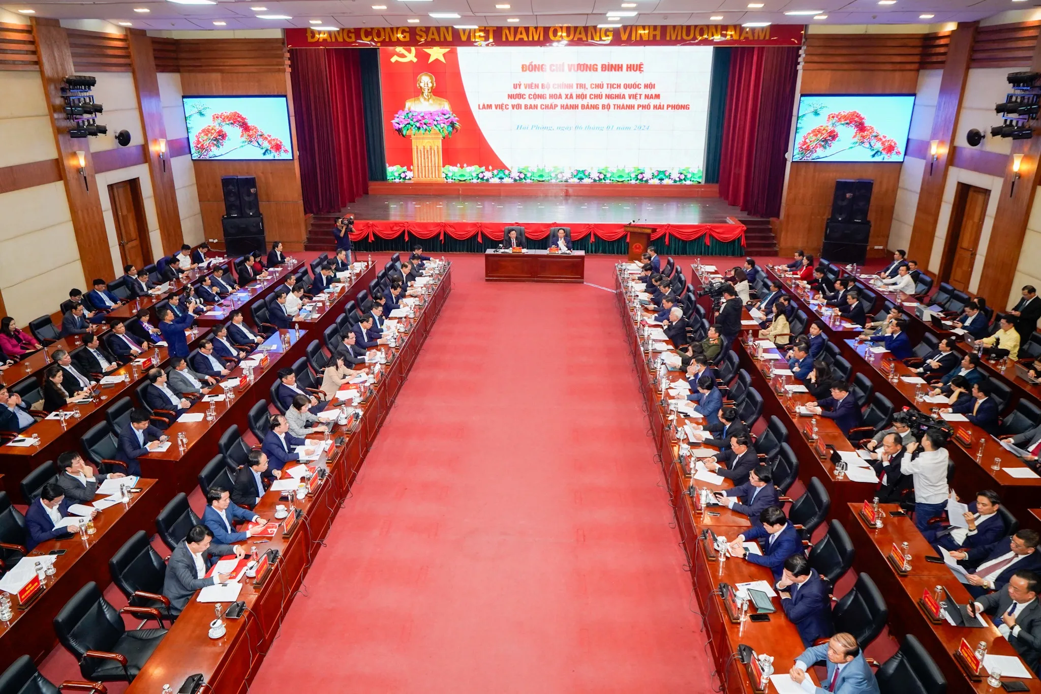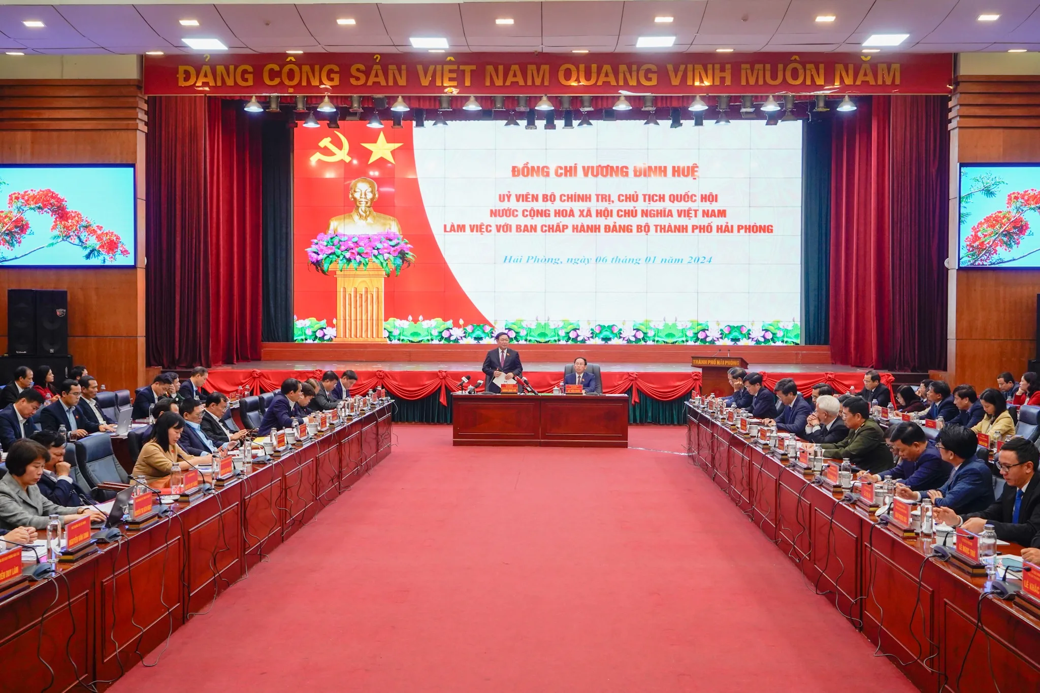 Chiều 06/01, đồng chí Vương Đình Huệ, Ủy viên Bộ Chính trị, Chủ tịch Quốc hội nước Cộng hòa XHCN Việt Nam làm việc với Ban Chấp hành Đảng bộ thành phố Hải Phòng. Cùng dự có các đồng chí Ủy viên Trung ương Đảng và lãnh đạo các Bộ, ban, ngành Trung ương.