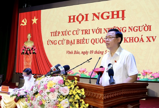Chủ tịch Quốc hội Vương Đình Huệ khẳng định, nếu được cử tri tín nhiệm, với trách nhiệm là đại biểu Quốc hội được bầu ở thành phố Cảng, sẽ thường xuyên quan tâm, theo dõi tình hình phát triển kinh tế-xã hội của Hải Phòng nói chung và các quận, huyện nơi mình được bầu nói riêng, cùng với Đoàn Đại biểu Quốc hội Hải Phòng luôn giữ mối quan hệ chặt chẽ, phối hợp với các cấp ủy Đảng, chính quyền, MTTQ các cấp của thành phố; đề xuất, hiến kế, kiến nghị những giải pháp cụ thể, để thực hiện thắng lợi Nghị quyết số 45 của Bộ Chính trị.