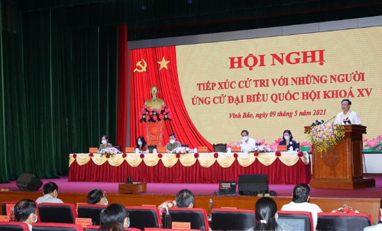 Sáng 9/5, Chủ tịch Quốc hội Vương Đình Huệ cùng các ứng cử viên dự Hội nghị tiếp xúc cử tri với những người ứng cử Đại biểu Quốc hội tại huyện Vĩnh Bảo, TP Hải Phòng.