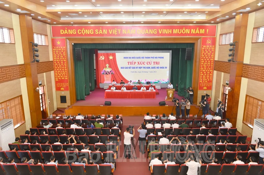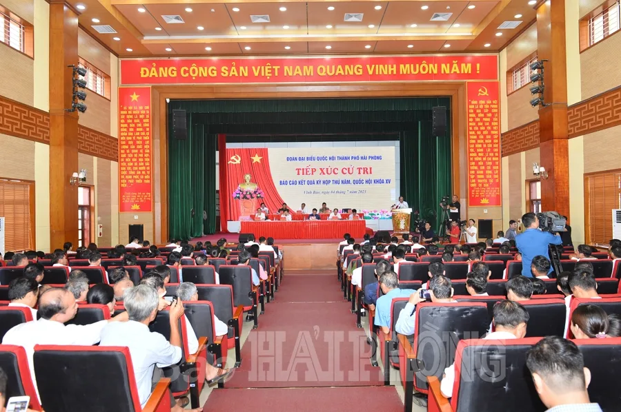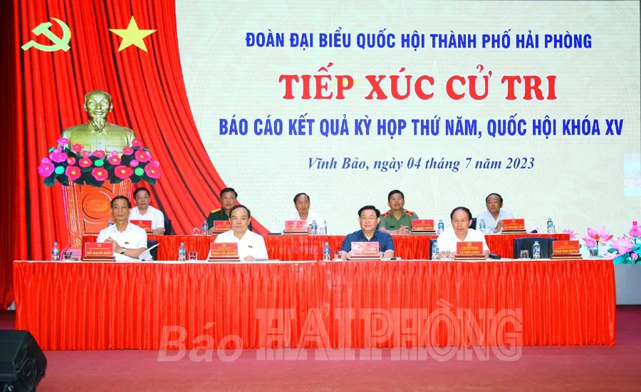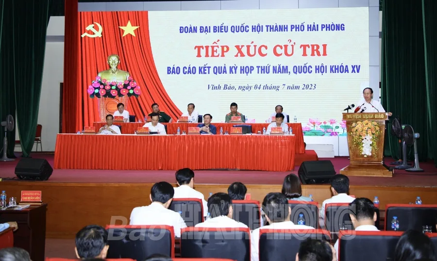 Sáng 4/7, tại Trung tâm văn hóa huyện Vĩnh Bảo, các đồng chí: Vương Đình Huệ, Ủy viên Bộ Chính trị, Chủ tịch Quốc hội; Trần Lưu Quang, Ủy viên Trung ương Đảng, Phó thủ tướng Chính phủ, Trưởng Đoàn đại biểu Quốc hội thành phố Hải Phòng; Lê Tiến Châu, Ủy viên Trung ương Đảng, Bí thư Thành ủy; Đỗ Mạnh Hiến, Phó bí thư Thường trực Thành ủy và các đại biểu Quốc hội thành phố Hải Phòng tiếp xúc cử tri, báo cáo kết quả Kỳ họp thứ 5, Quốc hội khóa 15.
