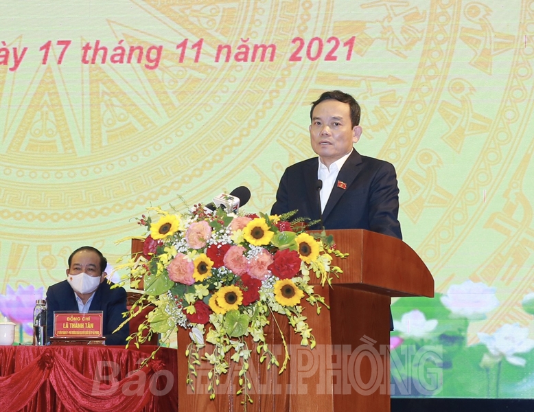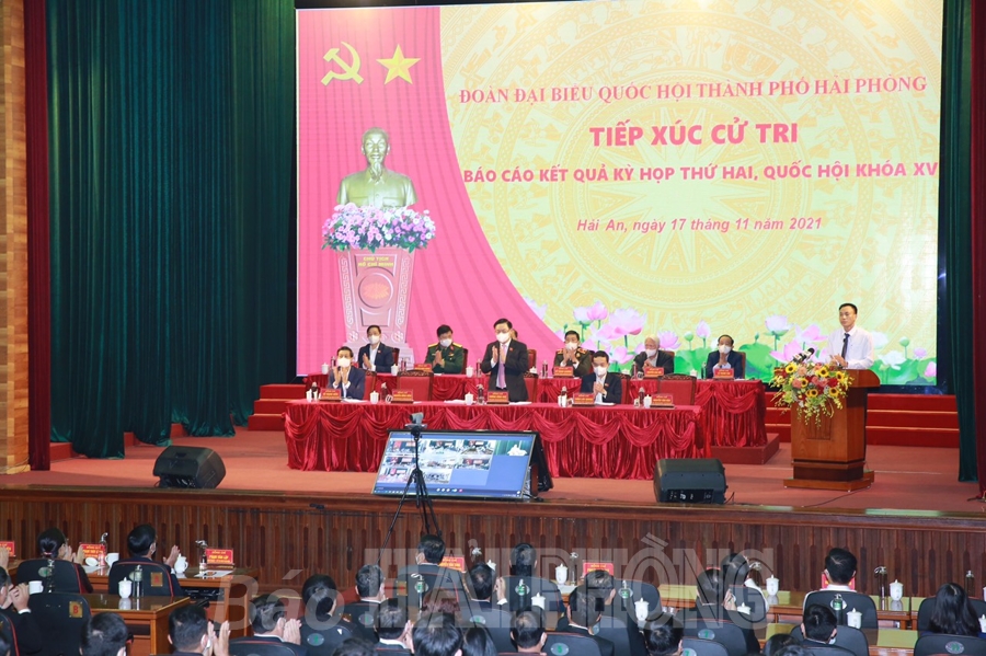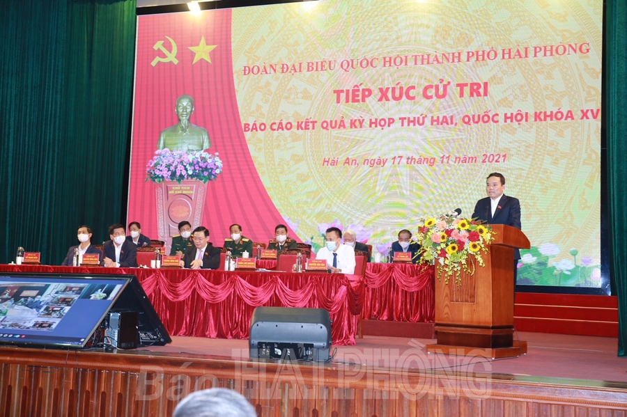 Chủ tịch Quốc hội Vương Đình Huệ trực tiếp trả lời các ý kiến, kiến nghị của cử tri Hải Phòng. Theo Chủ tịch Quốc hội, Nghị quyết về cơ chế, chính sách đặc thù phát triển Hải Phòng vừa được Quốc hội thông qua là sự cụ thể hóa Nghị quyết 45 của Bộ Chính trị, được Ủy ban Thường vụ Quốc hội, Quốc hội ủng hộ rất cao. Chủ tịch Quốc hội mong muốn, sau khi Nghị quyết được ban hành, thành phố Hải Phòng phối hợp chặt chẽ với các bộ, ngành Trung ương, tranh thủ sự ủng hộ của Chính phủ để triển khai thực hiện hiệu quả nghị quyết, phát huy tốt nhất vai trò động lực phát triển, sớm hoàn thành sự nghiệp CNH-HĐH, trở thành thành phố hàng đầu của cả nước và khu vực.