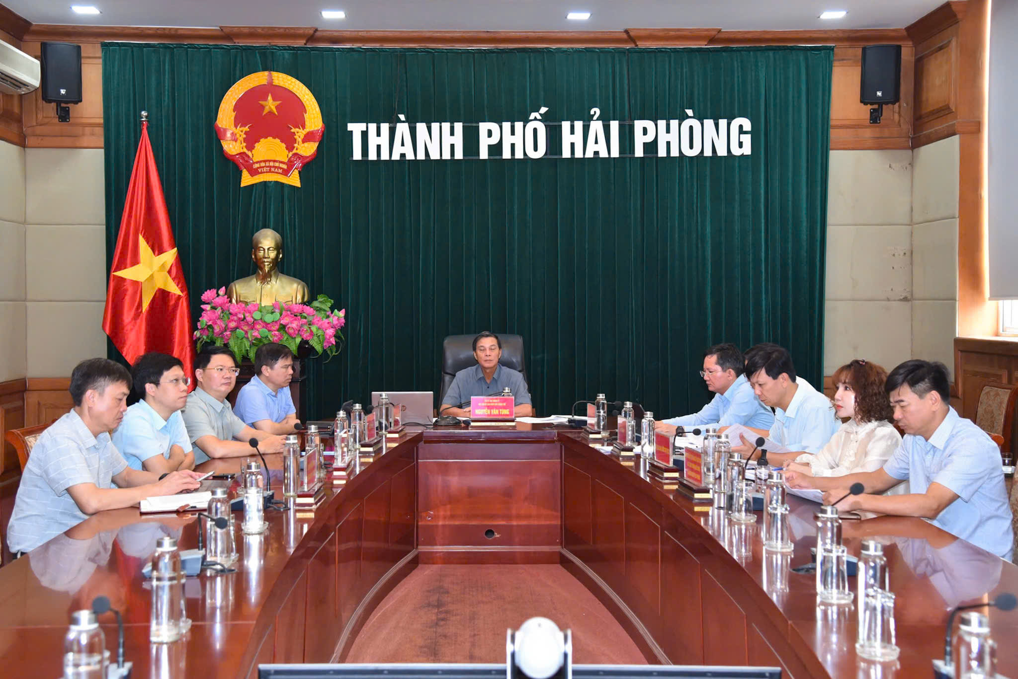 Chủ tịch UBND thành phố Nguyễn Văn Tùng dự Hội nghị tại điểm cầu thành phố Hải Phòng và lãnh đạo các Sở, ngành liên quan.