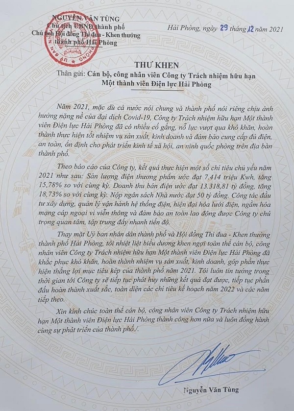 Chủ tịch UBND thành phố Nguyễn Văn Tùng vừa gửi Thư khen tới toàn thể cán bộ, công nhân viên Công ty Trách nhiệm hữu hạn Một thành viên Điện lực Hải Phòng (Điện lực Hải Phòng).