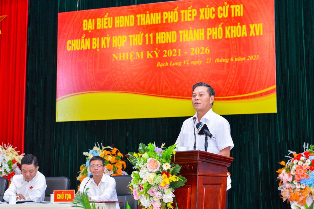 Cùng với giải đáp và làm rõ những nội dung mà cử tri huyện Bạch Long Vĩ quan tâm, Chủ tịch UBND thành phố Nguyễn Văn Tùng đã thông tin thêm tới cử tri về những kết quả nổi bật về kinh tế, xã hội cùng những chỉ đạo của lãnh đạo thành phố nhằm khơi thông những điểm nghẽn, nút thắt trong phát triển kinh tế tạo đà để hoàn thành chỉ tiêu, nhiệm vụ phát triển kinh tế, xã hội trong 6 tháng cuối năm.