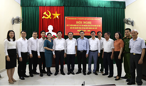 Tại hội nghị, Ủy ban MTTQ Việt Nam phường Tràng Minh đã công bố danh sách, tiểu sử của 4 đồng chí ứng cử viên đại biểu HĐND các cấp nhiệm kỳ 2021-2026. Trong đó, đồng chí Nguyễn Văn Tùng, Phó Bí thư Thành ủy, Bí thư Ban Cán sự Đảng, Chủ tịch UBND thành phố ứng cử đại biểu HĐND thành phố Hải Phòng, nhiệm kỳ 2021-2026; ứng cử đại biểu HĐND cấp phường gồm các đồng chí: Phan Huy Cường, Trưởng Công an phường Lãm Hà ứng cử đại biểu HĐND phường Lãm Hà, nhiệm kỳ 2021-2026; Nguyễn Xuân Đài, Bí thư Chi bộ Tổ dân phố Minh Khai 1 ứng cử đại biểu HĐND phường Tràng Minh, nhiệm kỳ 2021-2026; Trần Thị Thu Hương, công chức Văn phòng-Thống kê UBND phường Tràng Minh ứng cử đại biểu HĐND phường Tràng Minh.