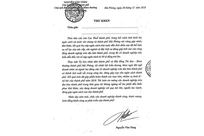 Chủ tịch UBND thành phố Nguyễn Văn Tùng vừa có thư khen gửi 23 doanh nghiệp tiêu biểu dẫn đầu nộp ngân sách nhà nước với số nộp ngân sách từ 50 tỷ đồng trở lên. Nội dung thư như sau: