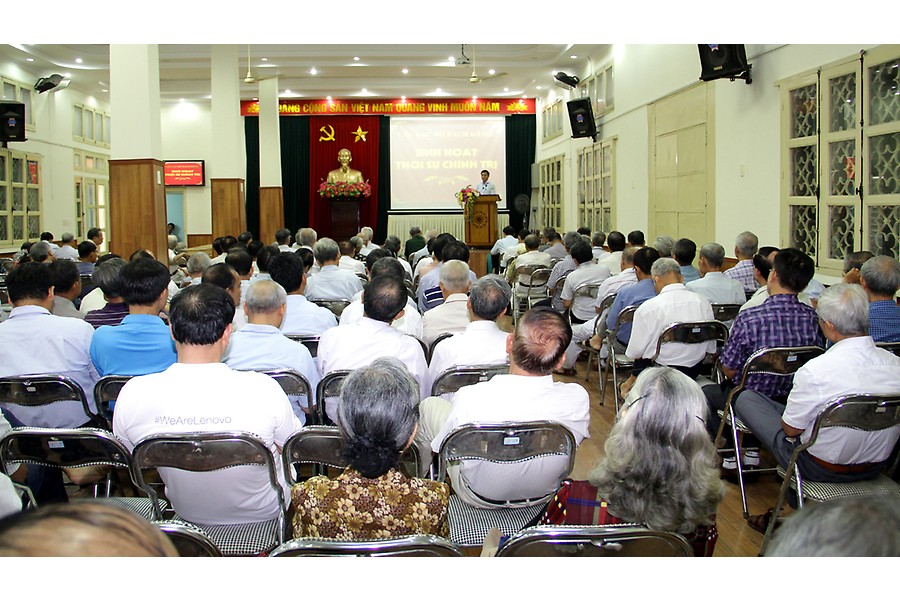 Đồng chí Nguyễn Văn Tùng, Chủ tịch UBND thành phố nói chuyện thời sự chính trị với các hội viên Câu lạc bộ Bạch Đằng. Ảnh: Thu Hiền