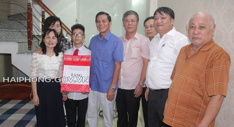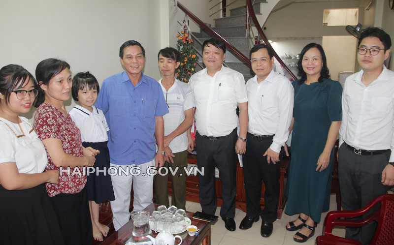 Chủ tịch UBND thành phố Nguyễn Văn Tùng tới thăm, tặng quà cháu Nguyễn Thị Ngọc Mai, sinh năm 2012, tại số nhà 8/B79, tổ dân phố B1, phường Cát Bi; cháu bị bệnh tan máu bẩm sinh, thường xuyên phải đi bệnh viện lọc máu; hoàn cảnh gia đình khó khăn, bố cháu sức khỏe yếu không thể lao động, mẹ làm công nhân giầy da; cháu là học sinh xuất sắc lớp 2A4, Trường Tiểu học Cát Bi.