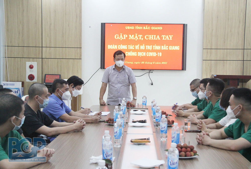 Phát biểu tại buổi chia tay, Phó Chủ tịch UBND tỉnh Phan Thế Tuấn gửi lời cảm ơn tới tập thể cán bộ, y, bác sỹ thành phố Hải Phòng đã không ngại vất vả, khó khăn, ngày đêm dành tâm huyết, hỗ trợ điều trị cho các bệnh nhân COVID-19 tại Trung tâm hồi sức cấp cứu ICU-Bệnh viện Tâm thần Bắc Giang.