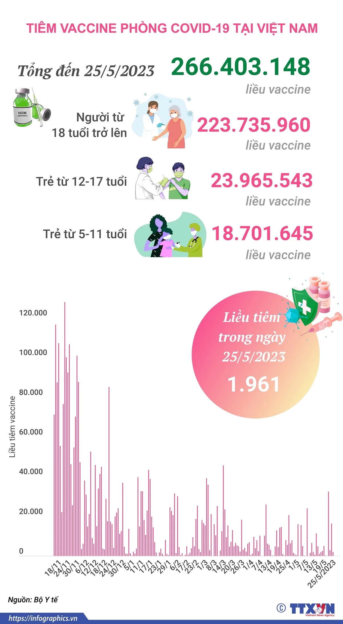 Tính đến ngày 27/5, Việt Nam đã có hơn 266 triệu liều vaccine COVID-19 được tiêm; trong đó tiêm tiêm cho người từ 18 tuổi trở lên là hơn 223 triệu liều; tiêm cho trẻ từ 12-17 tuổi là hơn 23,9 triệu liều; tiêm cho trẻ từ 5-11 tuổi là hơn 18,7 triệu liều.