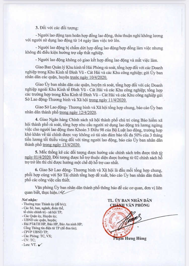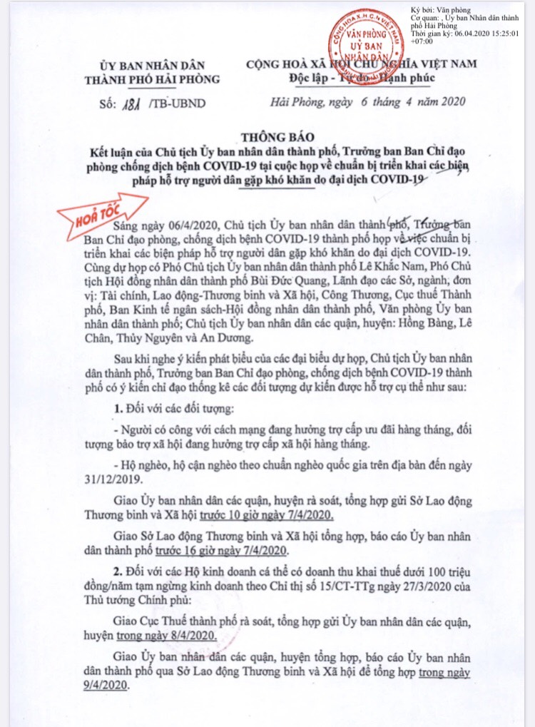 Sáng ngày 06/4/2020, Chủ tịch UBND thành phố, Trưởng ban Ban Chỉ đạo phòng, chống dịch bệnh Covid-19 thành phố họp về việc chuẩn bị triển khai các biện pháp hỗ trợ người dân gặp khó khăn do đại dịch Covid-19. Cùng dự họp có Phó Chủ tịch UBND thành phố Lê Khắc Nam, Phó Chủ tịch HĐND thành phố Bùi Đức Quang, Lãnh đạo các Sở, ngành, đơn vị: Tài chính, Lao động-Thương binh và Xã hội, Công thương, Cục thuế thành phố, Ban Kinh tế Ngân sách HĐND thành phố, Chủ tịch UBND các quận, huyện: Hồng Bàng, Lê Chân, Thủy Nguyên và An Dương.