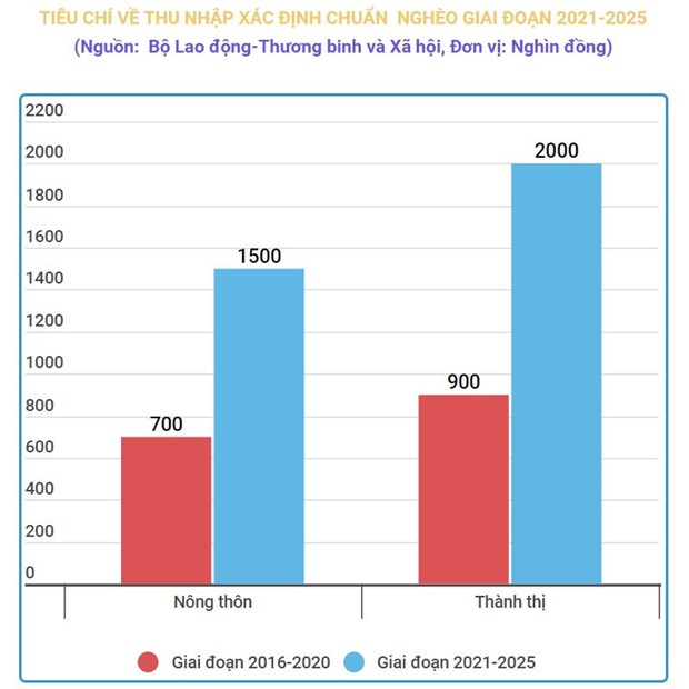 Trên cơ sở tính toán của Tổng cục Thống kê (Bộ Kế hoạch và Đầu tư), ước tính ngân sách thực hiện và mục tiêu nâng cao chất lượng cuộc sống cho người nghèo phù hợp với điều kiện kinh tế-xã hội giai đoạn 2021-2025, Bộ Lao động-Thương binh và Xã hội đề xuất áp dụng tiêu chí về thu nhập sẽ tương ứng với chuẩn mức sống tối thiểu là 1,5 triệu đồng/người/tháng ở khu vực nông thôn (hiện nay là 700.000 đồng/người/tháng, tăng 114,2%) và 2 triệu đồng/người/tháng ở khu vực thành thị (hiện nay là 900.000 đồng/người/tháng, tăng 122,2%).
