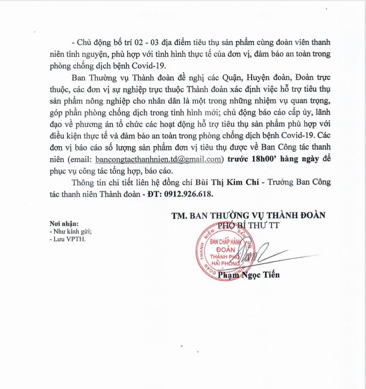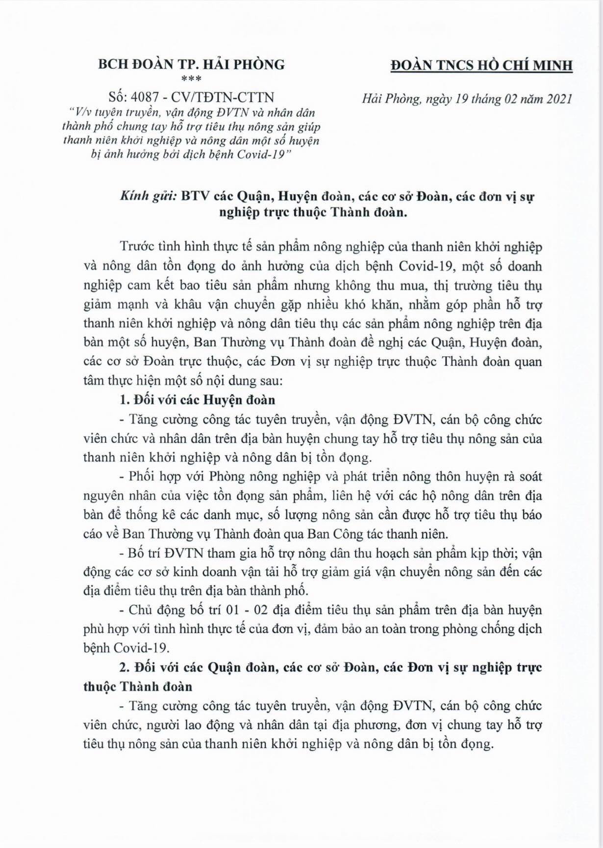 Thành Đoàn Hải Phòng vừa có Công văn số 4087-CV/TĐTN-CTTN ngày 19/02/2021 về việc tuyên truyền, vận động đoàn viên thanh niên và nhân dân thành phố chung tay hỗ trợ tiêu thụ nông sản giúp thanh niên khởi nghiệp và nông dân một số huyện bị ảnh hưởng bởi dịch bệnh Covid-19.