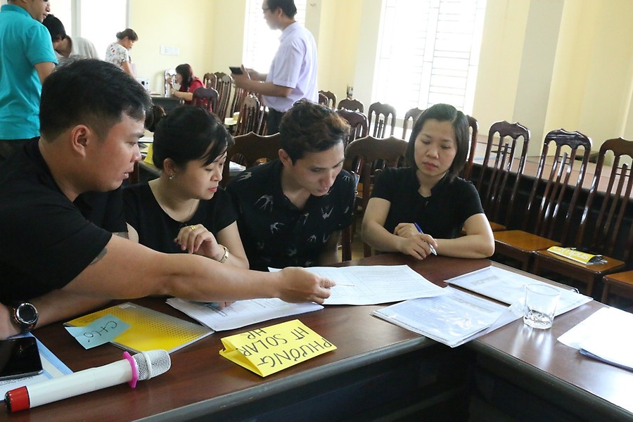 Cán bộ công đoàn Khu công nghiệp Tràng Duệ thực hành bài tập nhóm về xây dựng kế hoạch hành động thương lượng thỏa ước lao động tập thể.