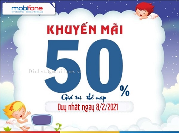 Chương trình khuyến mãi 50% thẻ nạp Mobifone 8/2/2021 mang đến mức ưu đãi hấp dẫn, đang mở ra cơ hội gia tăng tài khoản với mức chi phí tiết kiệm cho tất cả thuê bao. Vì vậy quý khách hãy chớp ngay cơ hội tuyệt vời này để xuyên suốt tháng 2 thả ga liên lạc mà không phải vướng bận về chi phí nhé! Dichvu3gmobifone.vn chúc quý khách nạp thẻ thành công!