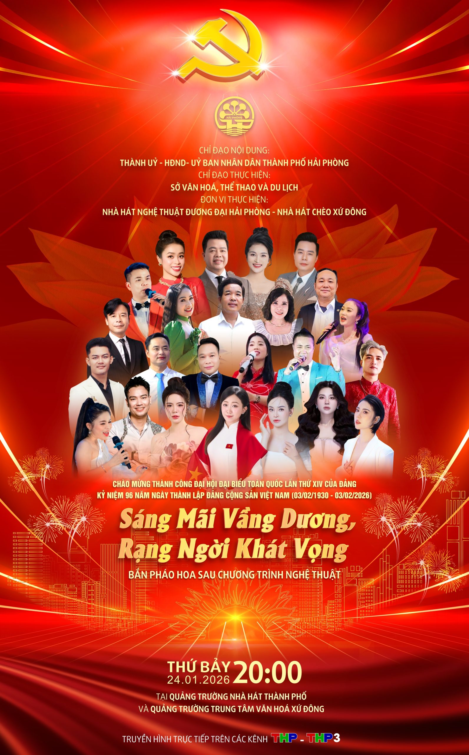Chương trình nghệ thuật “Sáng mãi vầng dương – Rạng ngời khát vọng” sẽ được tổ chức tối 24/1/2026 chào mừng thành công Đại hội đại biểu toàn quốc lần thứ XIV của Đảng, kỷ niệm 96 năm Ngày thành lập Đảng Cộng sản Việt Nam (03/02/1930 – 03/02/2026) và 80 năm Ngày Tổng tuyển cử đầu tiên bầu Quốc hội Việt Nam (06/01/1946 – 06/01/2026).
