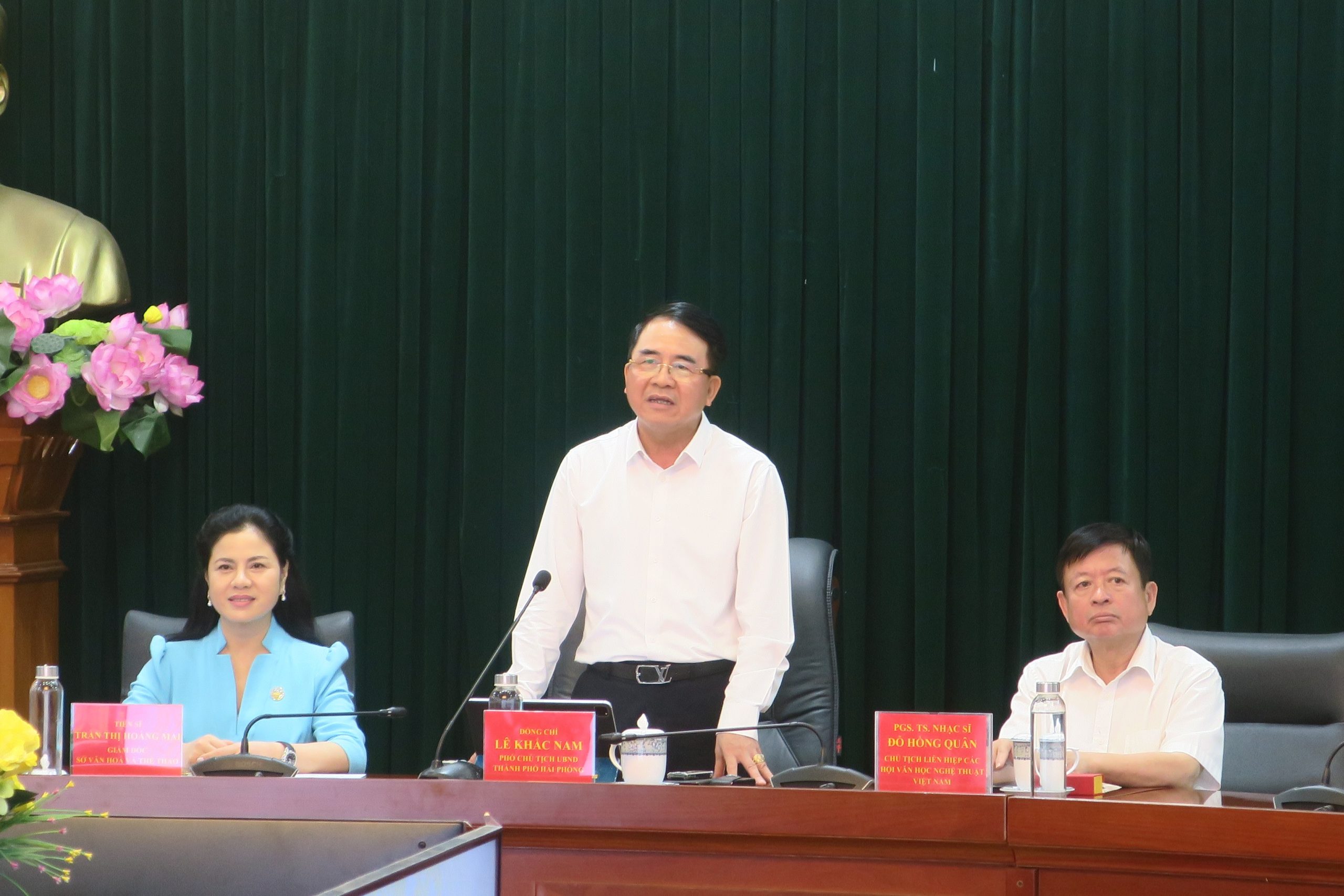 Sau khi nghe các đại biểu đóng góp ý kiến, Phó Chủ tịch UBND thành phố Lê Khắc Nam phát biểu, đồng chí cho biết: Thành phố Hải Phòng có chiều dày lịch sử, chiều sâu văn hóa, với nhiều văn nghệ sĩ để lại dấu ấn sâu đậm trong lĩnh vực văn học nghệ thuật của cả nước. Đến nay, thành phố cũng tạo rất nhiều điều kiện thuận lợi cho các đoàn nghệ thuật, các văn nghệ sĩ của thành phố có cơ hội thể hiện tài năng; đồng thời thu hút các nghệ sĩ từ các tỉnh, thành phố khác tới biểu diễn, sáng tác, công tác để tạo cơ hội cho các nghệ sĩ của Hải Phòng học tập, trau dồi kinh nghiệm. Sau một thời gian triển khai, chất lượng các vở diễn năm sau luôn cao hơn năm trước, được nâng lên tầm cao mới, thu hút đông đảo khán giả mọi lứa tuổi thưởng thức.