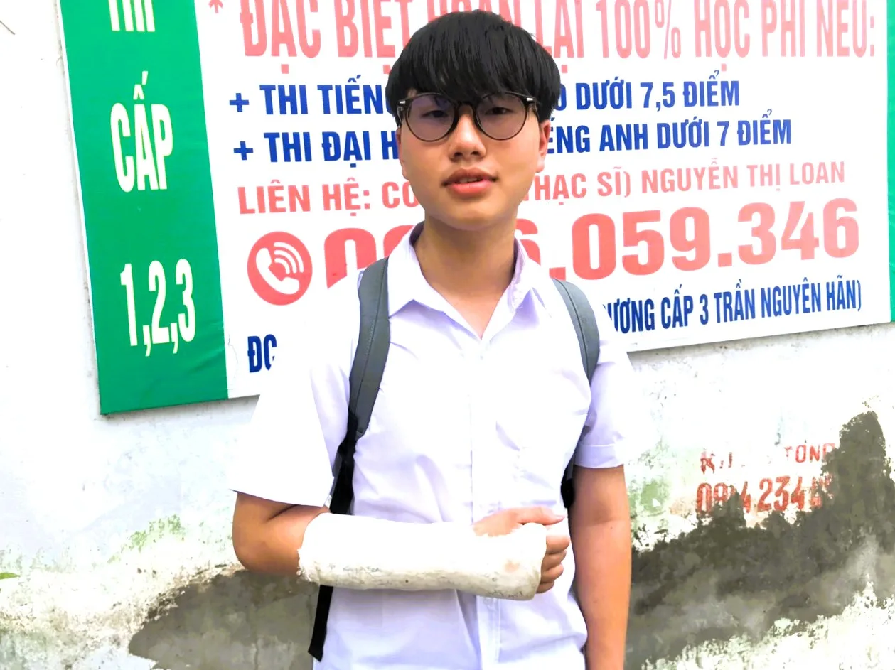 Trước ngày thi vào lớp 10 THPT khoảng 2 tuần, nam sinh lớp 9 bất ngờ gặp tai nạn, gẫy tay phải. Khi biết không thể dùng tay phải để viết trong thời gian bó bột, hai mẹ con đã khóc rất nhiều vì kỳ thi đang tới gần. Nhưng may mắn đã mìm cười khi được Sở GD&ĐT tạo điều kiện cho thi với quy chế riêng.