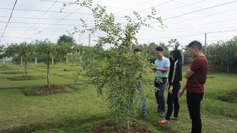 Các thành viên trong CLB phát triển kinh tế phường Bàng La tham quan mô hình trồng táo giàn tại địa phương