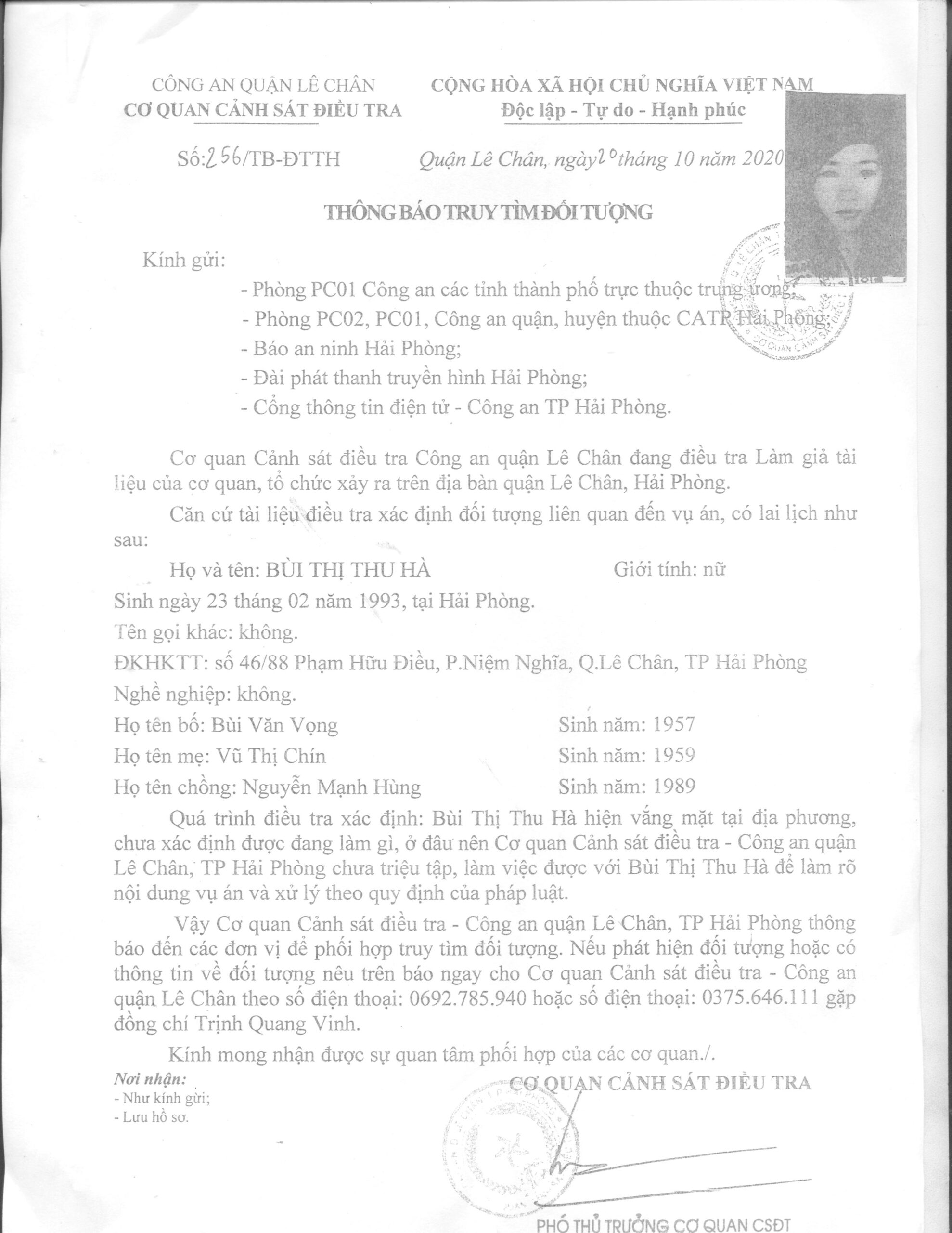 Mọi công dân khi phát hiện Bùi Thị Thu Hà có lai lịch như trên thì báo ngay cho Cơ quan Cảnh sát điều tra (Đội Điều tra tổng hợp) – Công an quận Lê Chân, địa chỉ: số 122 Hai Bà Trưng, phường An Biên, quận Lê Chân, TP Hải Phòng hoặc liên hệ số điện thoại: 0692.785.940 hoặc 0375.646.111 gặp điều tra viên Trịnh Quang Vinh.