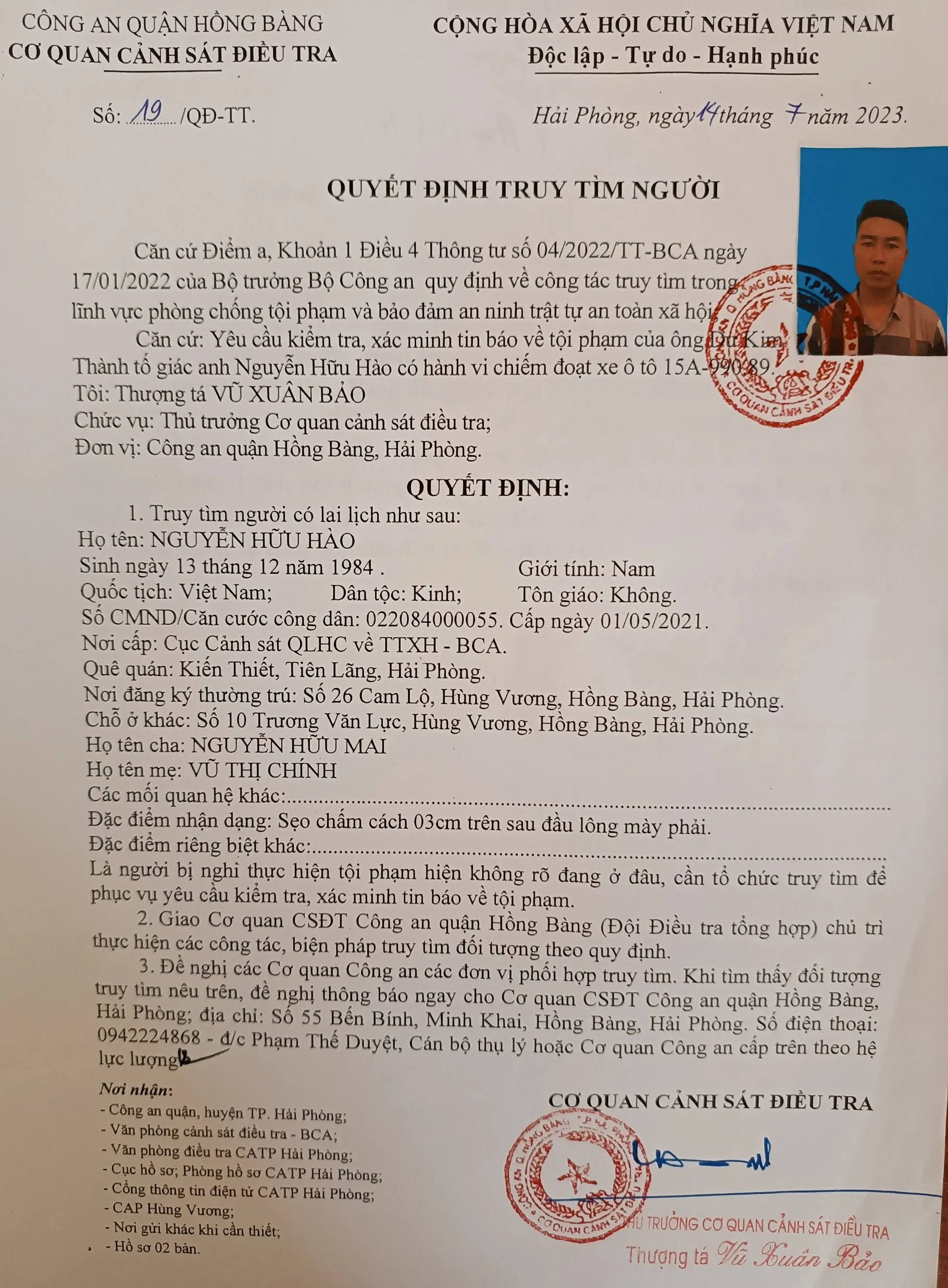 Để phục vụ công tác kiểm tra, xác minh nguồn tin về tội phạm Cơ quan CSĐT Công an quận Hồng Bàng thông báo Quyết định truy tìm người số 19 ngày 14 tháng 7 năm 2023 của Cơ quan CSĐT Công an quận Hồng Bàng, Hải Phòng đối với anh Nguyễn Hữu Hào, sinh năm 1984, nơi thường trú số 26 Cam Lộ, Hùng Vương, Hồng Bàng, Hải Phòng là người bị tố giác trong vụ việc trên.