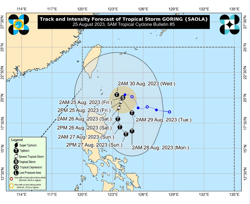 Theo bản tin dự báo bão của PASAGA, vào hồi 4h ngày 25.8, Goring nằm cách Basco, Batanes 220km về phía đông đông nam, di chuyển chậm về phía tây nam. Dự kiến đây sẽ là một cơn bão nhiệt đới có tốc độ di chuyển chậm.