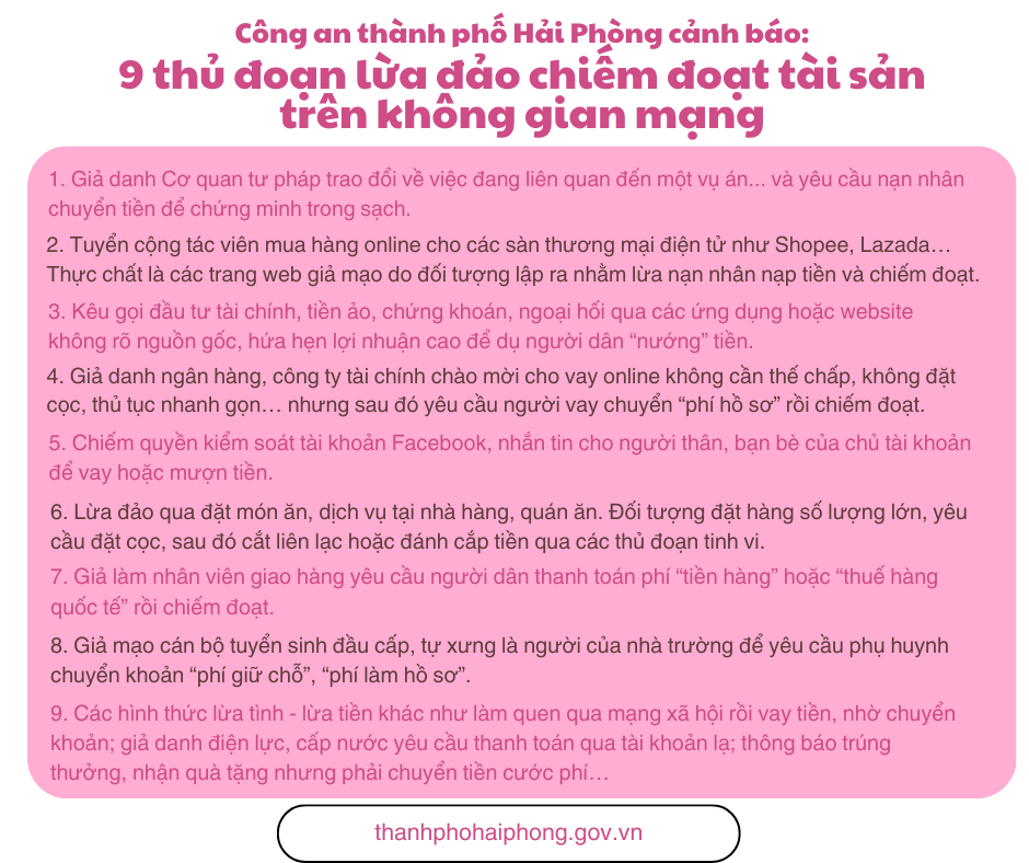 Nếu phát hiện dấu hiệu nghi ngờ liên quan đến lừa đảo, hãy liên hệ ngay cơ quan Công an gần nhất hoặc Đội 3 – Phòng An ninh mạng và phòng, chống tội phạm sử dụng công nghệ cao, Công an TP Hải Phòng để được hỗ trợ và xử lý kịp thời.
