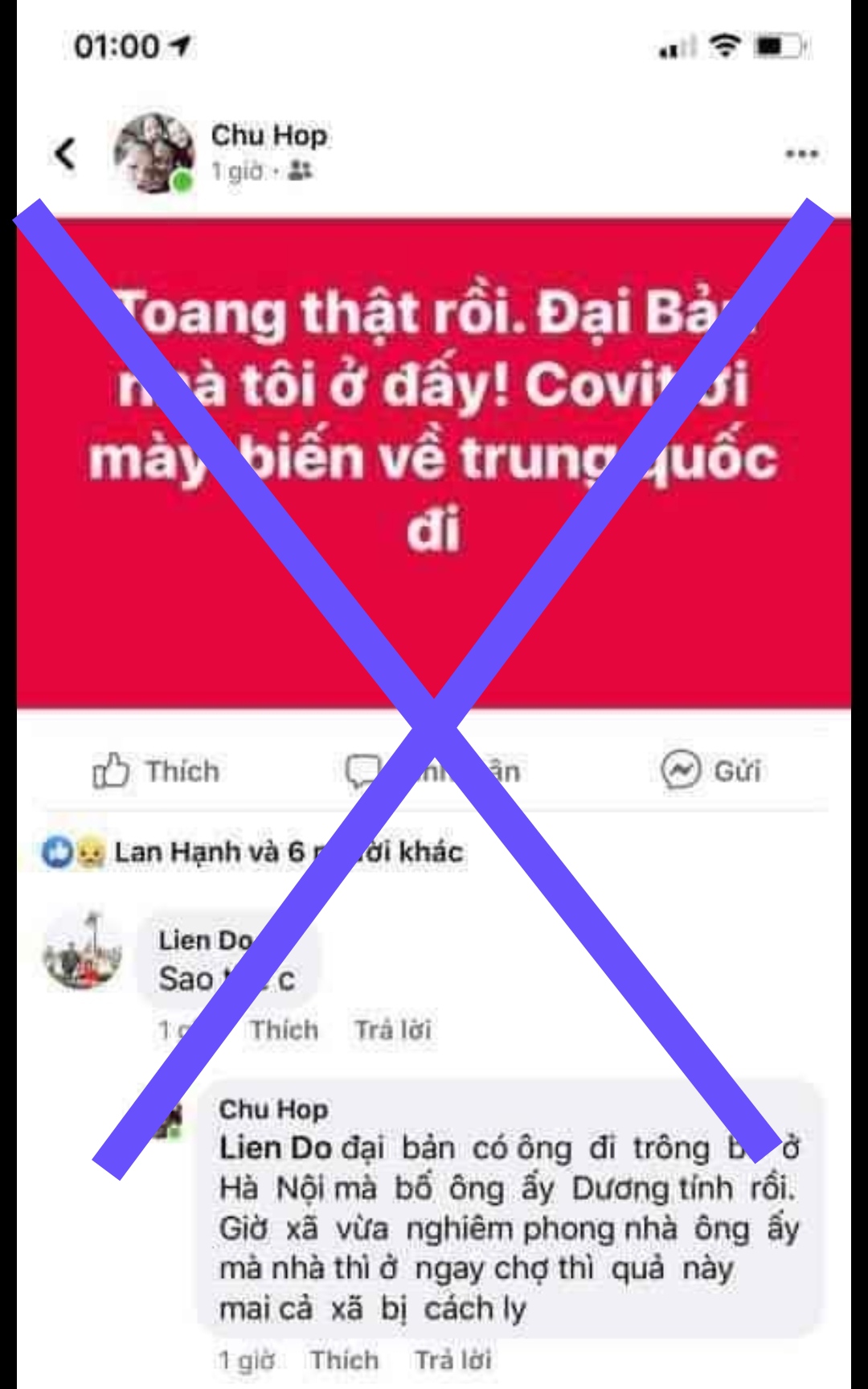 Qua công tác nắm tình hình thông tin trên mạng xã hội Facebook, vào hồi 01h00′ ngày 28/3/2020, tài khoản facebook cá nhân ‘Chu Hop‘ đã đăng tải bài viết có nội dung: “Toang thật rồi. Đại Bản nhà tôi ở đấy! Covit ơi mày biến về Trung Quốc đi” và bình luận “đại bản có ông đi trông bố ở Hà Nội mà ông ấy Dương tính rồi. Vừa xã vừa nghiêm phong nhà ông ấy mà nhà thì ở ngay chợ thì quả này mai cả xã bị cách ly“.