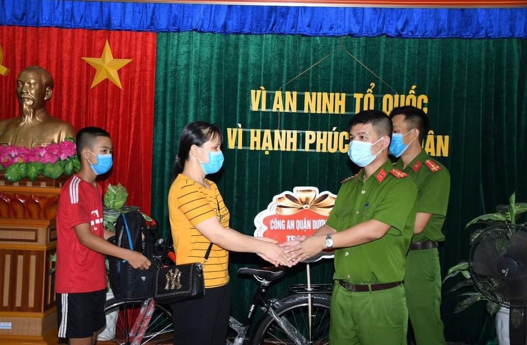 Với mong muốn chia sẻ khó khăn, động viên tinh thần đối với gia đình và cháu Hoàng Văn Quyến, Công an quận Dương Kinh đã mua tặng cháu 01 chiếc xe đạp, 01 ba lô mới.