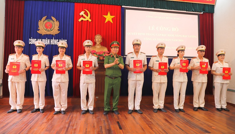 Sáng 24-6, Công an quận Hồng Bàng tổ chức lễ công bố Quyết định của Bộ trưởng Bộ Công an và Giám đốc CATP về việc nâng lương, thăng cấp bậc hàm cho CBCS Công an quận năm 2019. Đến dự buổi lễ có các đồng chí: Đại tá Nguyễn Văn Coỏng, Phó giám đốc CATP, Thủ trưởng Cơ quan CSĐT – CATP; Trần Quang Tuấn, Phó bí thư thường trực Quận ủy, Chủ tịch HĐND quận Hồng Bàng; Hoàng Thị Nhẫn, Phó chủ tịch thường trực UBND quận, Trưởng BCĐ 799 quận Hồng Bàng.