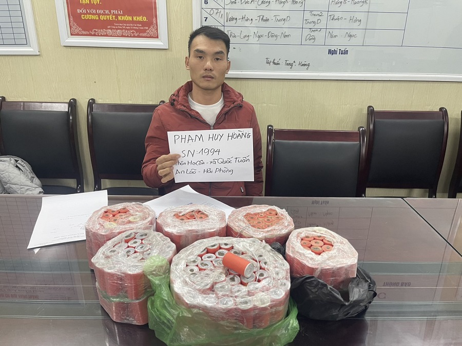 Tổ công tác tiến hành kiểm tra, phát hiện ở thùng xe 1 bảo tải dứa màu xanh lá cây, bên trong đựng 6 cuộn băng pháo có tổng số 367 quả pháo hình trụ tròn, vỏ cuốn giấy màu đỏ. Người nam giới điều khiển xe khai tên là Phạm Huy Hoàng, sinh 1994, ĐKHKTT thôn Hạ Câu, xã Quốc Tuấn, huyện An Lão, TP. Hải Phòng. Tại cơ quan công an, Hoàng thừa nhận số pháo trên là của Hoàng mua về sử dụng. Trong lúc Hoàng đang dừng xe chờ giao hàng thì bị lực lượng công an kiểm tra, thu giữ.