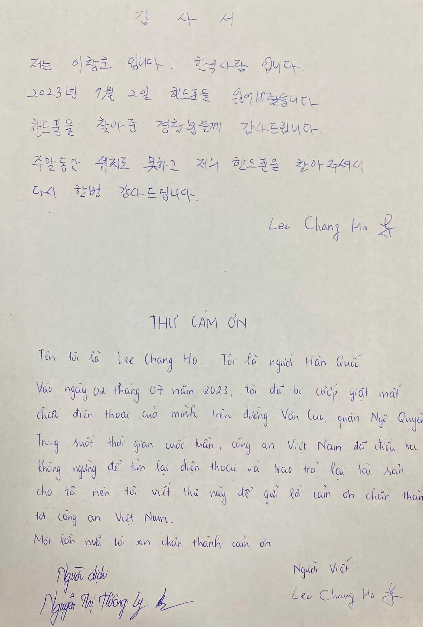 Nhận lại tài sản của mình, ông Lee Chang Ho đã bày tỏ sự cảm ơn và bất ngờ vì chỉ trong thời gian rất ngắn, Công an quận Ngô Quyền đã điều tra làm rõ, bắt giữ đối tượng và tìm lại được tài sản của ông.