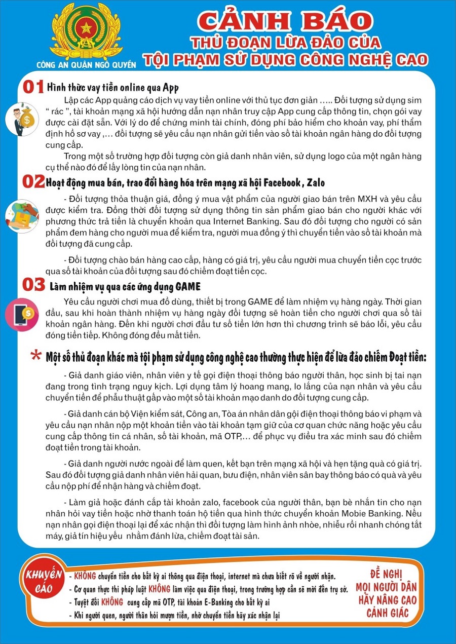 Thực hiện chỉ đạo của Lãnh đạo Công an quận Ngô Quyền, Đội Cảnh sát Hình sự phối hợp với Công an các phường dán áp phích và tờ rơi đến các tổ dân phố, các hộ dân trên địa bàn quận và các phương tiện thông tin đại chúng nhằm phòng ngừa, phát hiện, đấu tranh, ngăn chặn với tội phạm sử dụng công nghệ cao lừa đảo, chiếm đoạt tài sản.