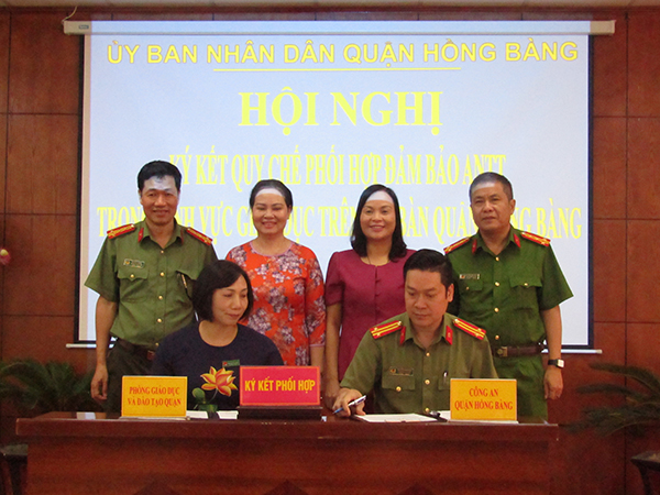 Nhằm tăng cường hiệu quả công tác quản lý nhà nước, đảm bảo an ninh trật tự trong lĩnh vực giáo dục và đào tạo; chủ động phối hợp và áp dụng các biện pháp phòng ngừa, phát hiện đấu tranh với các loại tội phạm, các hành vi vi phạm pháp luật nhằm bảo vệ nội bộ và hoạt động bình thường của các cơ sở giáo dục trên địa bàn quận, Công an quận và Phòng GD-ĐT quận Hồng Bàng ký kết quy chế phối hợp về công tác đảm bảo an ninh, trật tự trong lĩnh vực giáo dục đào tạo.