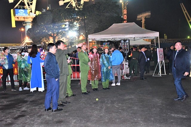 Tối 3-2, ngay từ 18h, lực lượng Công an đã có mặt tại khu vực cổng cảng 4 Cảng Hoàng Diệu để phân luồng, bảo đảm trật tự an toàn giao thông khu vực ngoài, bảo đảm ANTT khu vực khán đài, sân khấu, đảm bảo an toàn của các vị lãnh đạo Đảng, Nhà nước, thành phố Hải Phòng cùng hàng nghìn đại biểu đến từ các sở ngành, quận, huyện, xã, phường, thị trấn đến dự chương trình tại điểm cầu Hải Phòng.
