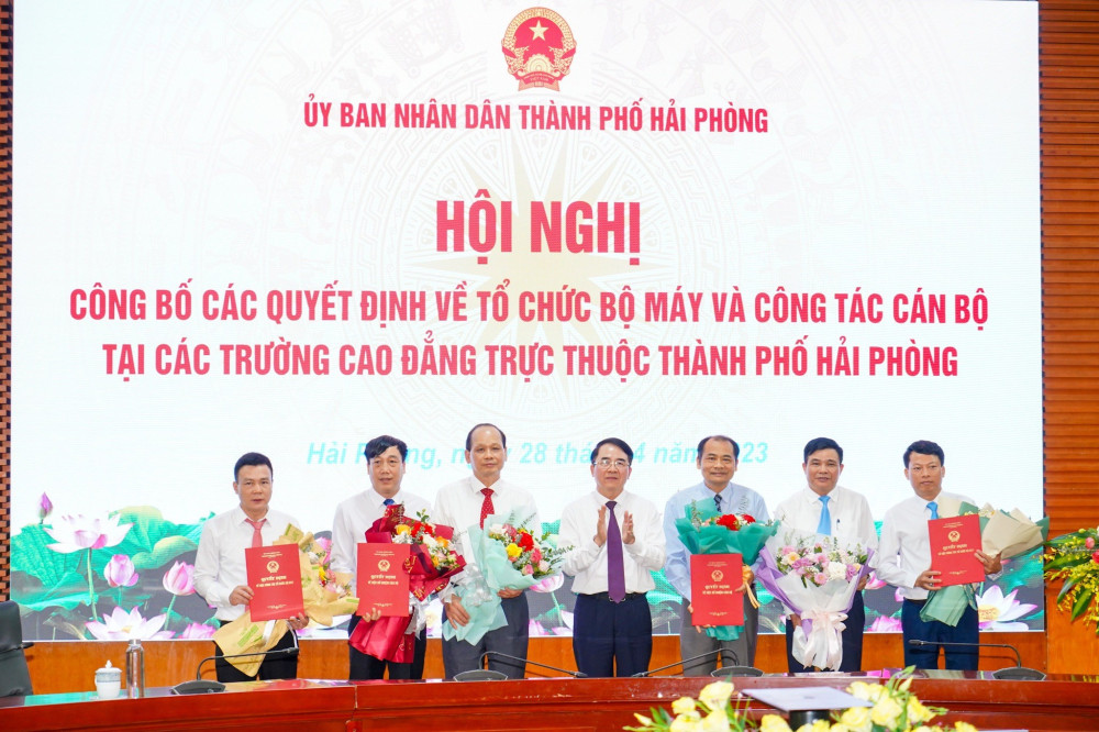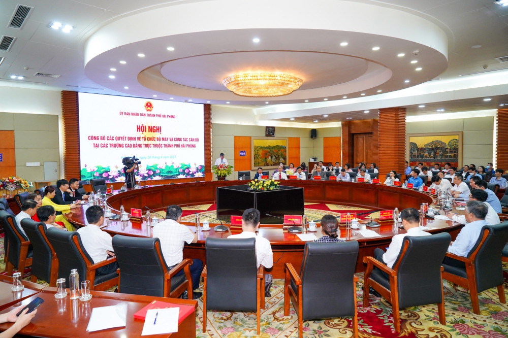 Hội nghị công bố các Quyết định số 1295 ngày 21/12/2022 của Bộ trưởng Bộ Lao động-Thương binh và Xã hội về việc sát nhập Trường Trung cấp Nông nghiệp Thủy sản vào Trường Cao đẳng Lao động Xã hội Hải Phòng và đổi tên thành Trường Cao đẳng Kinh tế Hải Phòng; và Quyết định số 1297 ngày 21/12/2022 của Bộ trưởng Bộ Lao động-Thương binh và Xã hội về việc sáp nhập Trường Cao đẳng Cộng đồng Hải Phòng, Trường Trung cấp Xây dựng vào Trường Cao đẳng Công nghiệp Hải Phòng và đổi tên thành Trường Cao đẳng Kỹ thuật Hải Phòng.
