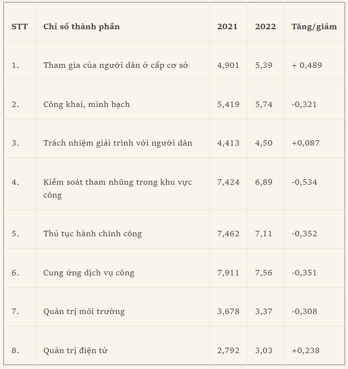 Theo bảng số liệu trên, chỉ số thành phần tăng gồm: Tham gia của người dân cấp cơ sở; Trách nhiệm giải trình với người dân, Quản trị điện tử; trong đó chỉ số thành phần Tham gia của người dân cấp cơ sở tăng nhiều nhất (tăng 9,9%). Đây đều là các chỉ số thành phần bị giảm điểm của năm 2021, đã được cải thiện theo chiều tăng điểm năm 2022; chỉ số thành phần Quản trị điện tử bị giảm nhiều nhất trong năm 2021 đã tăng điểm trong năm 2022. Các chỉ số thành phần giảm điểm gồm: Công khai, minh bạch; Kiểm soát tham nhũng trong khu vực công, thủ tục hành chính công, cung ứng dịch vụ công, quản trị môi trường, trong đó chỉ số thành phần Kiểm soát tham nhũng trong khu vực công bị giảm nhiều nhất (giảm 7,2%).