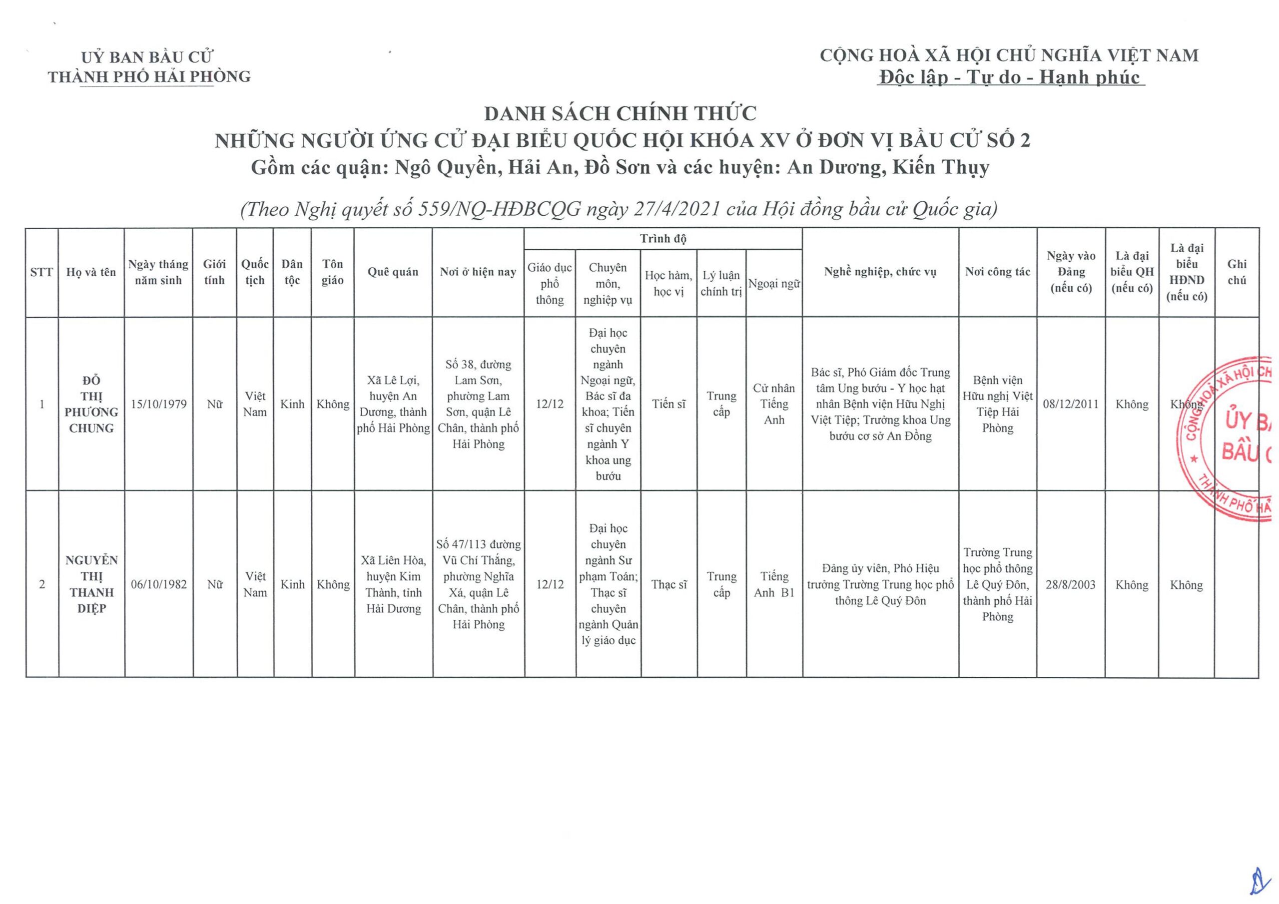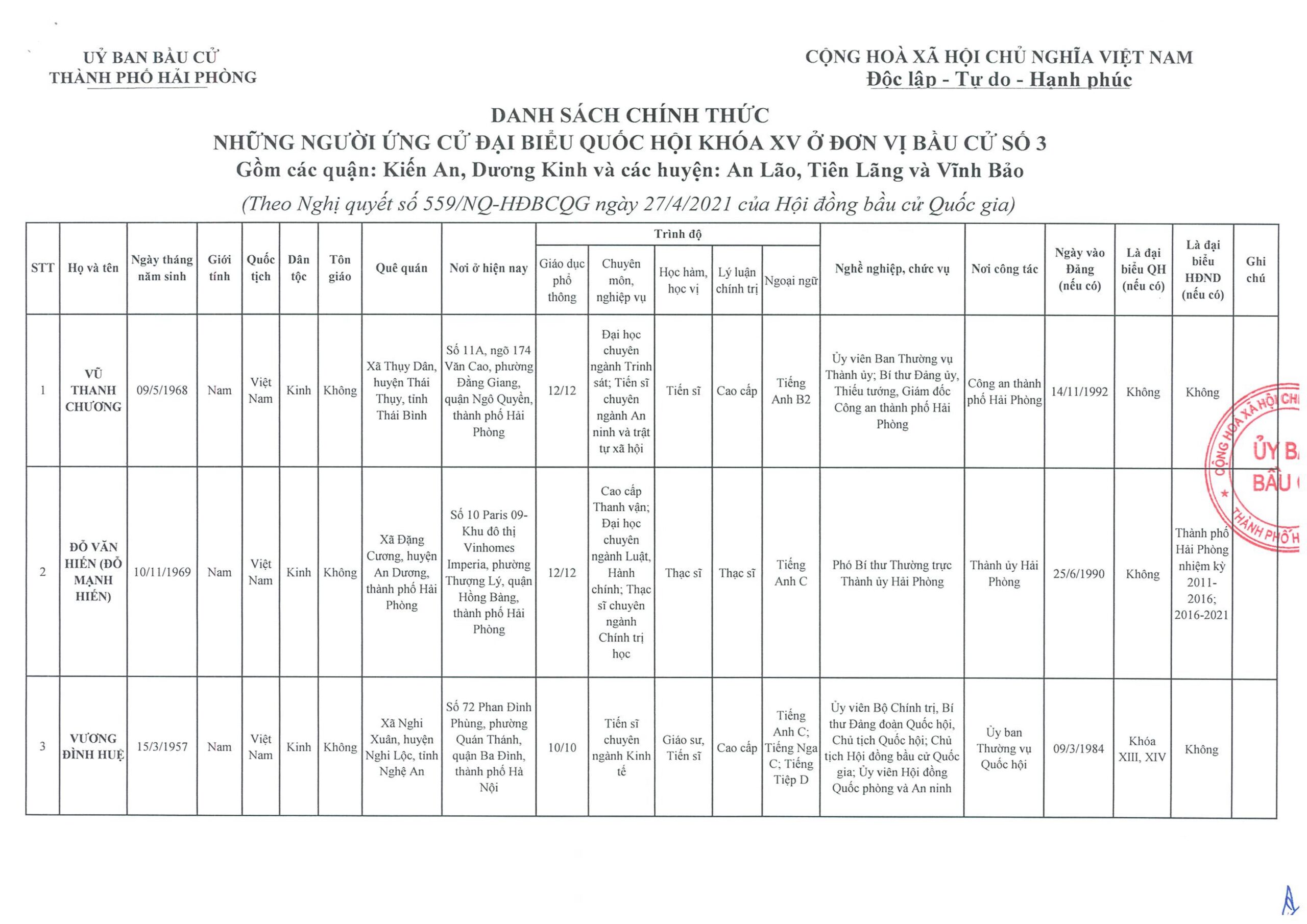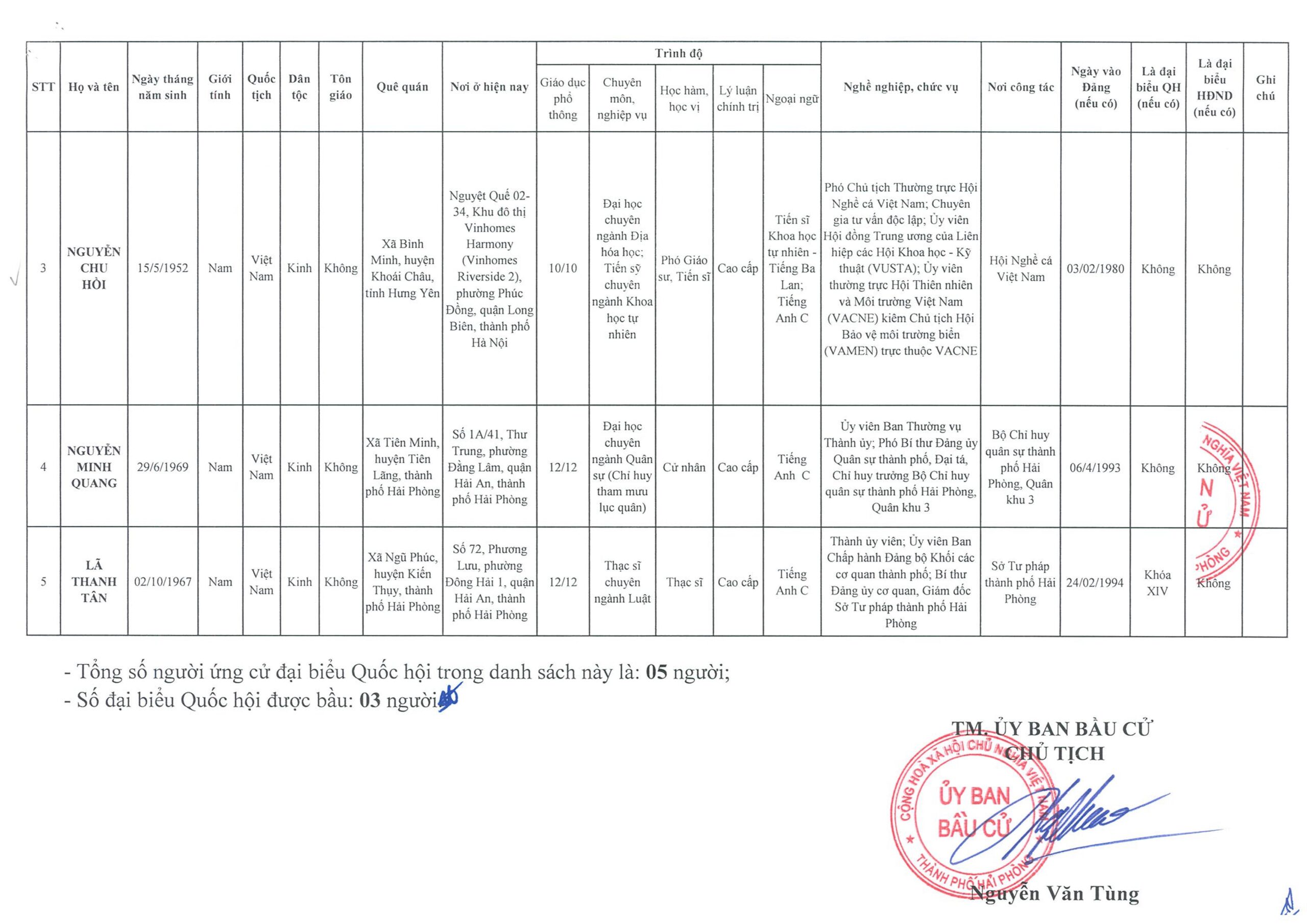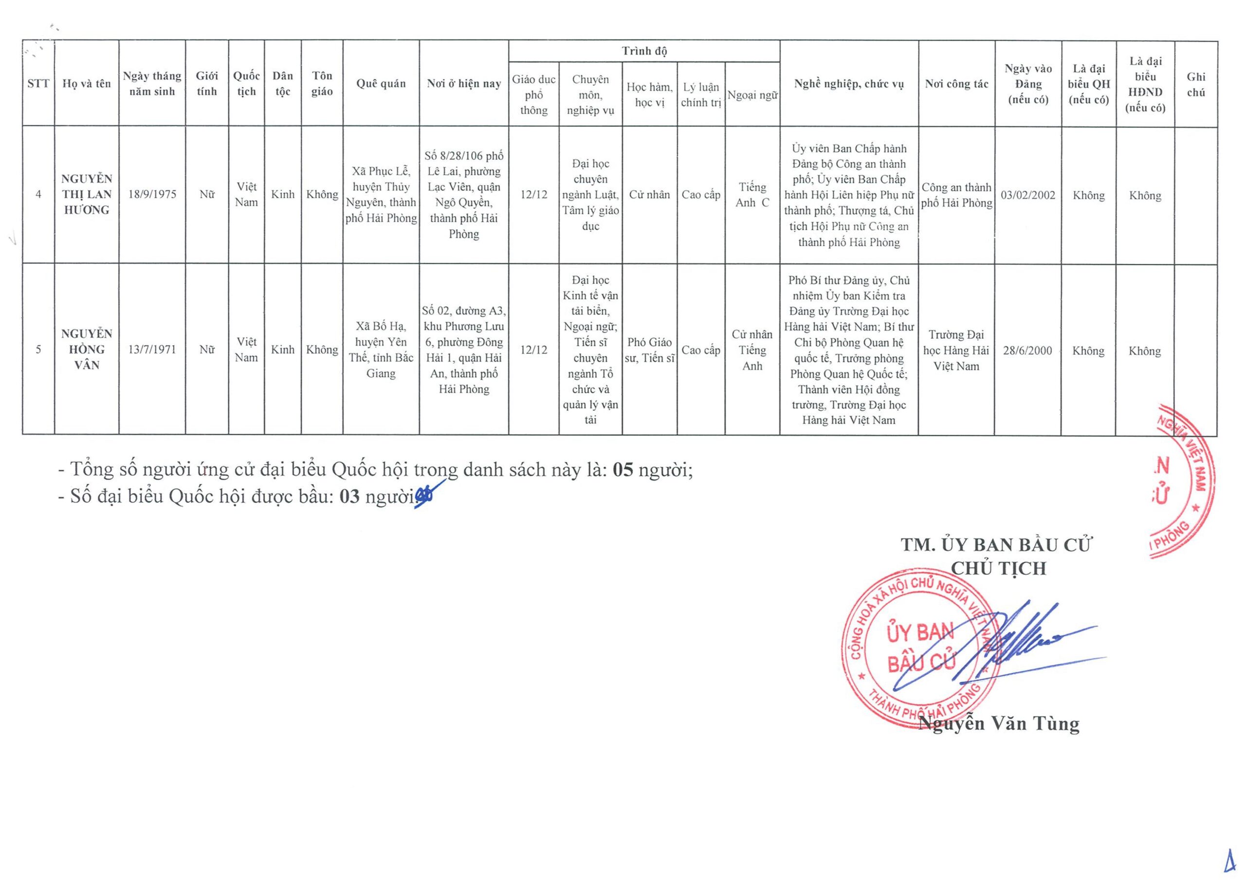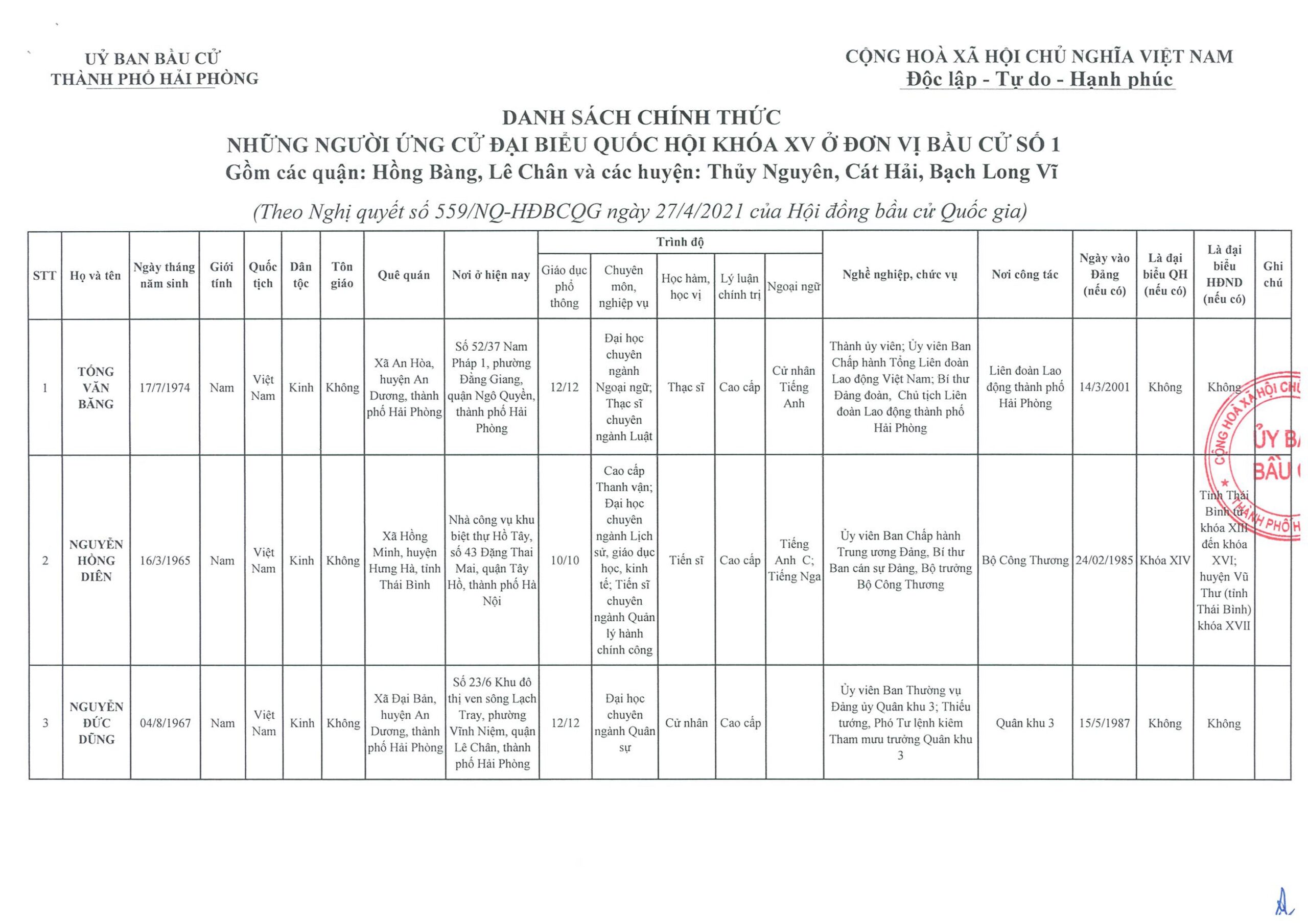 Ủy ban bầu cử thành phố Hải Phòng vừa có Thông báo số 18/TB-UBBC, ngày 28/4/2021 về việc công bố danh sách người ứng cử đại biểu Quốc hội khóa XV tại thành phố Hải Phòng theo Nghị quyết số 559/NQ-HĐBCQG ngày 27/4/2021 của Hội đồng bầu cử Quốc gia.