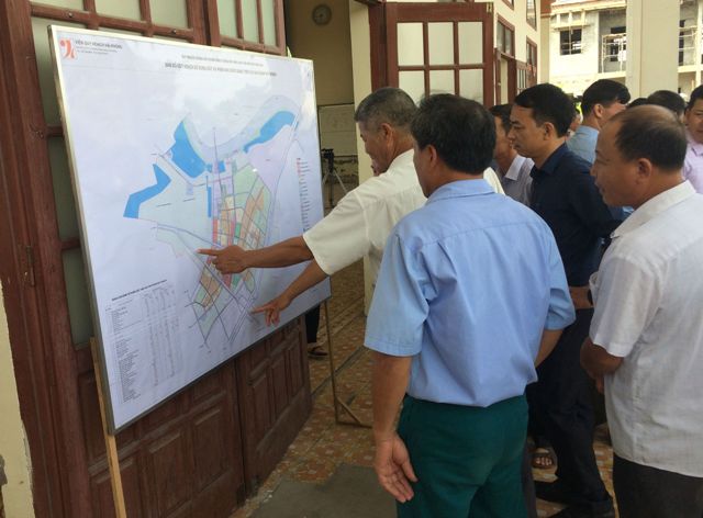 Các đại biểu nghiên cứu bản đồ Quy hoạch chung đô thị mới Hùng Thắng