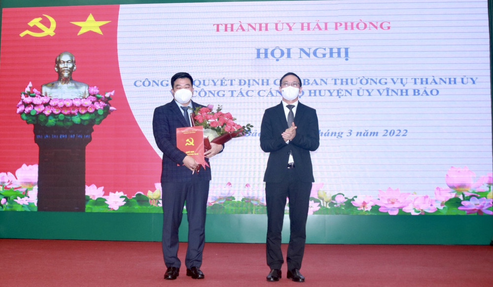 Đồng chí Đào Trọng Đức, Trưởng Ban Tổ chức Thành ủy trao quyết định, tặng hoa và chúc mừng đồng chí Lê Ngọc Lân được phân công nhận nhiệm vụ công tác mới và tin tưởng với trình độ chuyên môn, kinh nghiệm trong quá trình công tác, đồng chí Lân sẽ hoàn thành tốt các nhiệm vụ. Trưởng Ban Tổ chức Thành ủy đề nghị lãnh đạo, cán bộ, công chức huyện Vĩnh Bảo ủng hộ, tạo điều kiện giúp đỡ để đồng chí hoàn thành tốt nhiệm vụ được giao.
