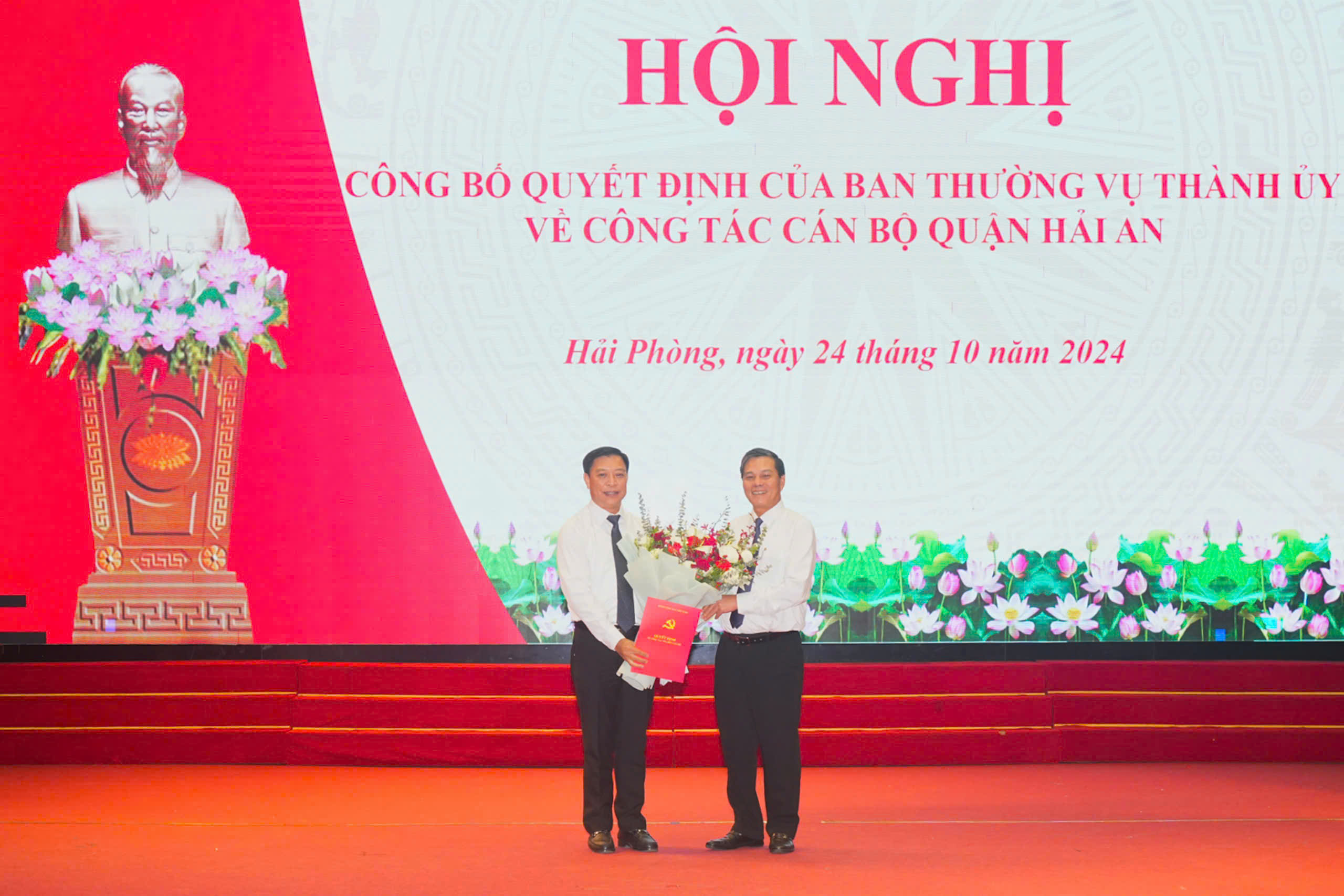 Chiều 24/10, Thường trực Thành uỷ triệu tập Hội nghị công bố Quyết định của Ban Thường vụ Thành ủy về công tác cán bộ quận Hải An. Đồng chí Nguyễn Văn Tùng, Phó Bí thư Thành ủy, Chủ tịch UBND thành phố chủ trì Hội nghị.