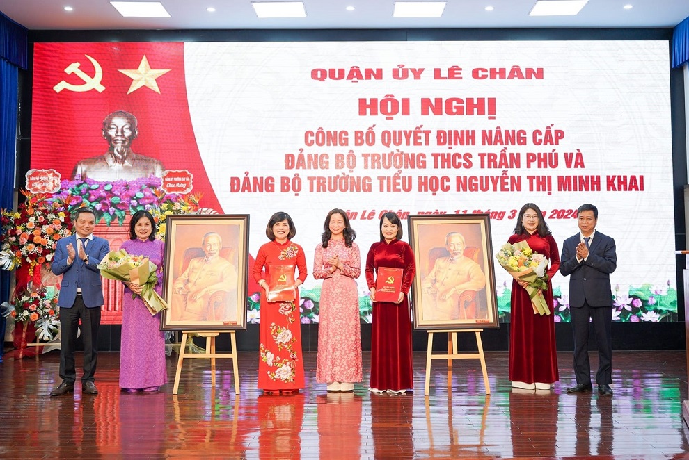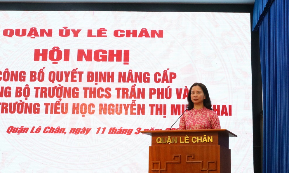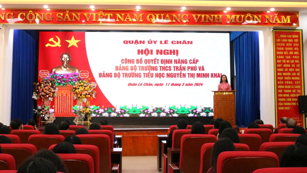Chiều 11/3, Quận ủy Lê Chân tổ chức Hội nghị công bố Quyết định nâng cấp Đảng bộ Trường THCS Trần Phú và Đảng bộ Trường Tiểu học Nguyễn Thị Minh Khai. Đồng chí Trần Thu Hương, Ủy viên Thành ủy, Bí thư Quận ủy chủ trì Hội nghị.