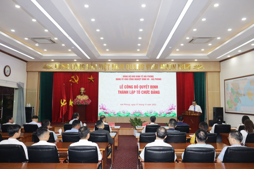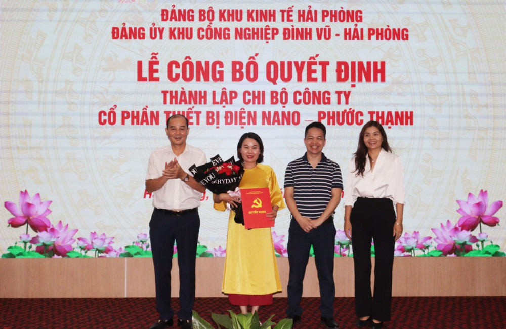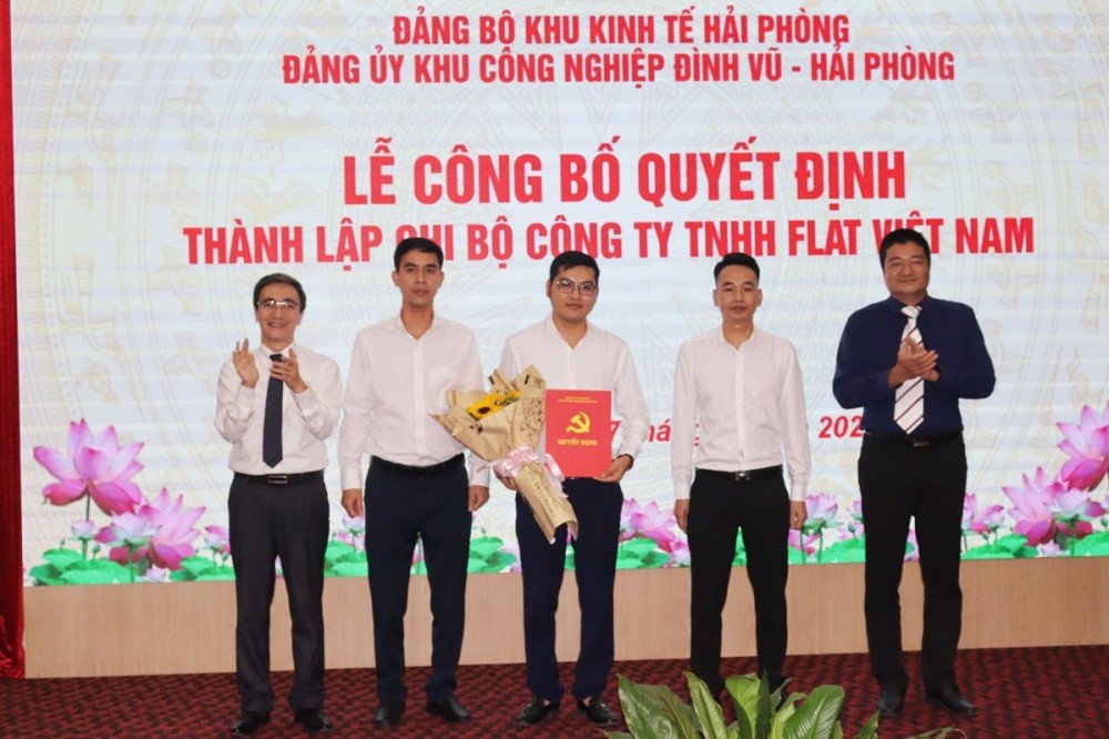 Chiều 07/11, Đảng ủy Khu kinh tế Hải Phòng chỉ đạo Đảng ủy Khu công nghiệp (KCN) Đình Vũ Hải Phòng tổ chức Lễ công bố quyết định thành lập Chi bộ Công ty TNHH Flat Việt Nam và Chi bộ Công ty Cổ phần thiết bị điện Nano-Phước Thạnh.