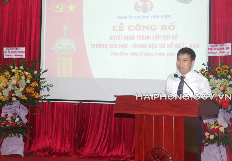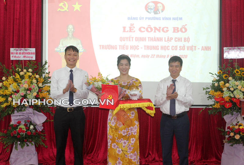 Thực hiện Nghị quyết số 28-NQ/TU ngày 10/11/2009 của Ban Thường vụ Thành ủy về “Xây dựng, củng cố và phát triển tổ chức Đảng, đoàn thể trong các loại hình doanh nghiệp ngoài nhà nước, sự nghiệp ngoài công lập”, chiều 22/9, Đảng ủy phường Vĩnh Niệm, quận Lê Chân tổ chức Hội nghị công bố quyết định thành lập Chi bộ trường Tiểu học – THCS Việt Anh. Đồng chí Phạm Văn Tân, Phó Bí thư Thường trực Quận ủy, Chủ tịch HĐND quận chủ trì Hội nghị.
